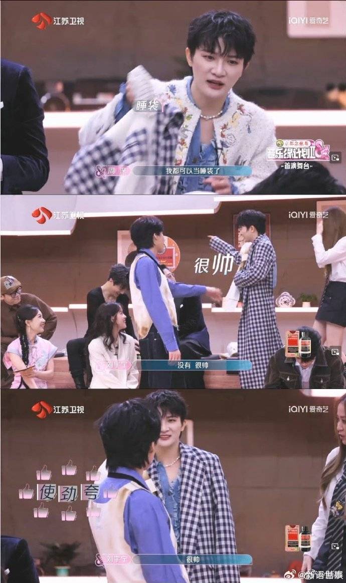 与此同时,周深对刘宇宁脱下的大衣产生了浓厚的兴趣,拿起来裹在身上。由于大衣尺码过大,他瞬间被完全包裹住,不停感叹:“我这都可以当睡袋了!”看到这一幕,刘宇宁立刻展现出了他天生的“销售员”气质。转身开始热情推销,没再提内搭的马甲,而是围着周深开始了360度全方位的夸奖:“很帅!买了买了!”他的推销技巧仿佛下一秒就要达成一笔交易,逗笑了全场。
