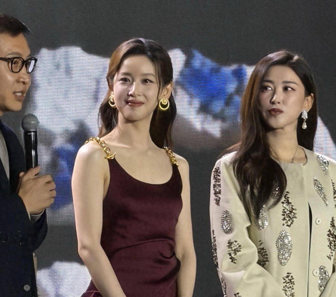 章泽天的酒红色长裙热情似火,像盛放的玫瑰,美得张扬而直接。朱珠的明黄色造型温润如玉,如历经岁月沉淀的美酒,越品越有味道。