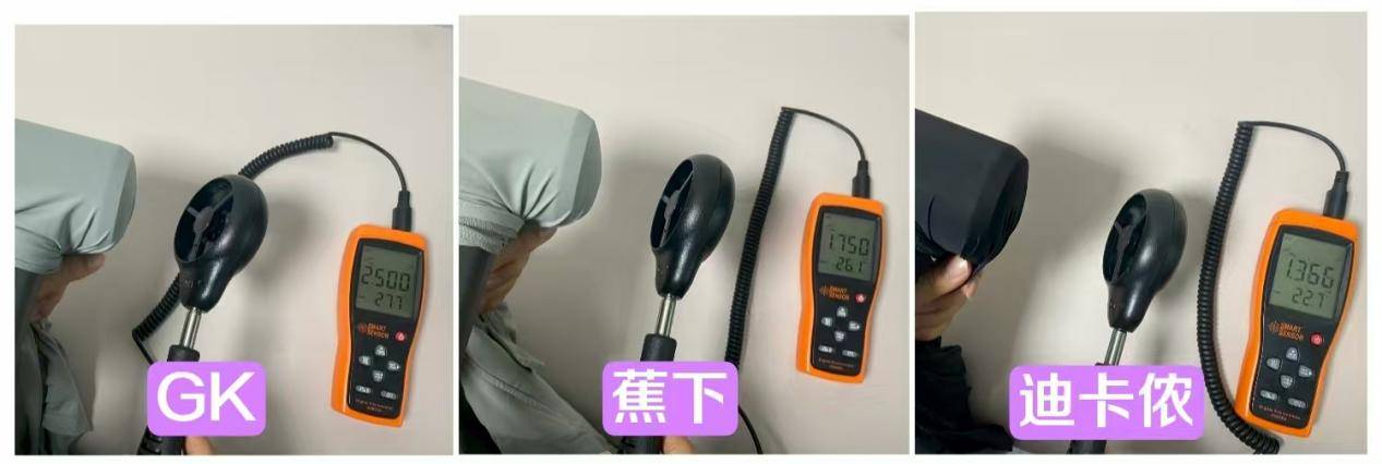 作为服饰,防晒衣的透气性能也是我们挑选产品时的重要依据之一,品牌方选的面料,透气设计等方面之间搭配不好,防晒衣穿着出门很容易会闷汗,然后防晒衣被汗水浸湿,黏糊糊的,透气性好的款则没有这些问题。本篇给Gakior、蕉下和迪卡侬防晒衣安排的透气性能测试主要是拿它们包裹吹风机,测吹风机风速变化,再结合实际的穿着舒适度感受来评估各款产品的透气性能。