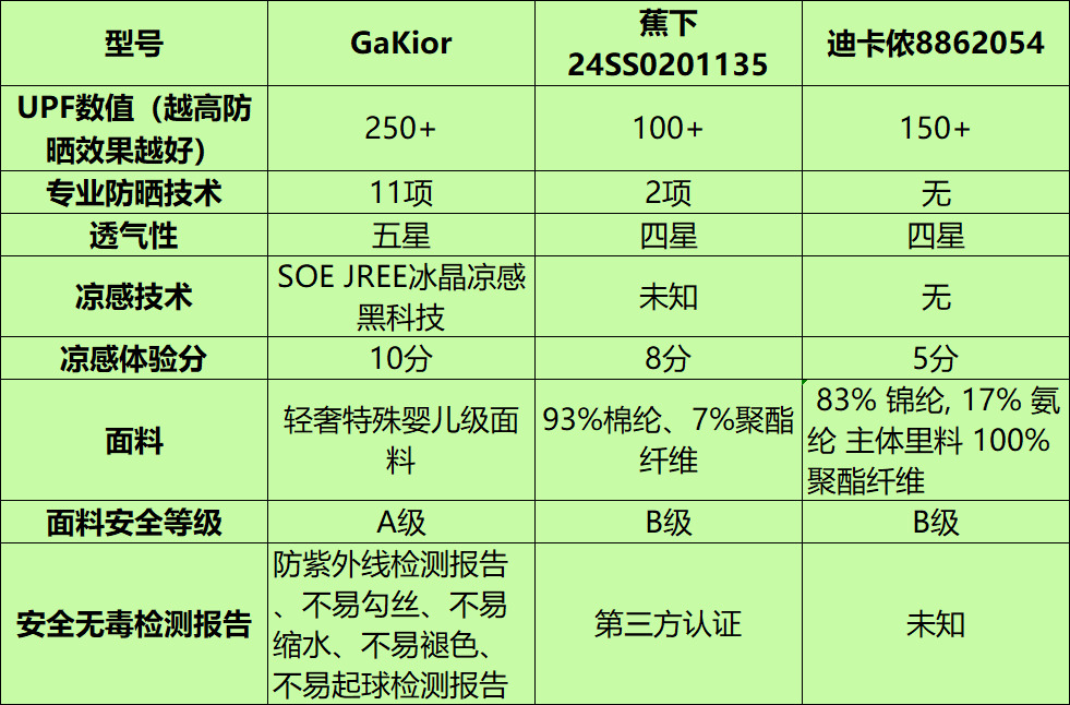要客观,理性的去选防晒衣,通过产品核心性能参数对比能帮我们排除掉不少非专业款的产品,还能有效对比不同款之间有哪些差异,Gakior、蕉下和迪卡侬防晒衣的核心参数见下图: