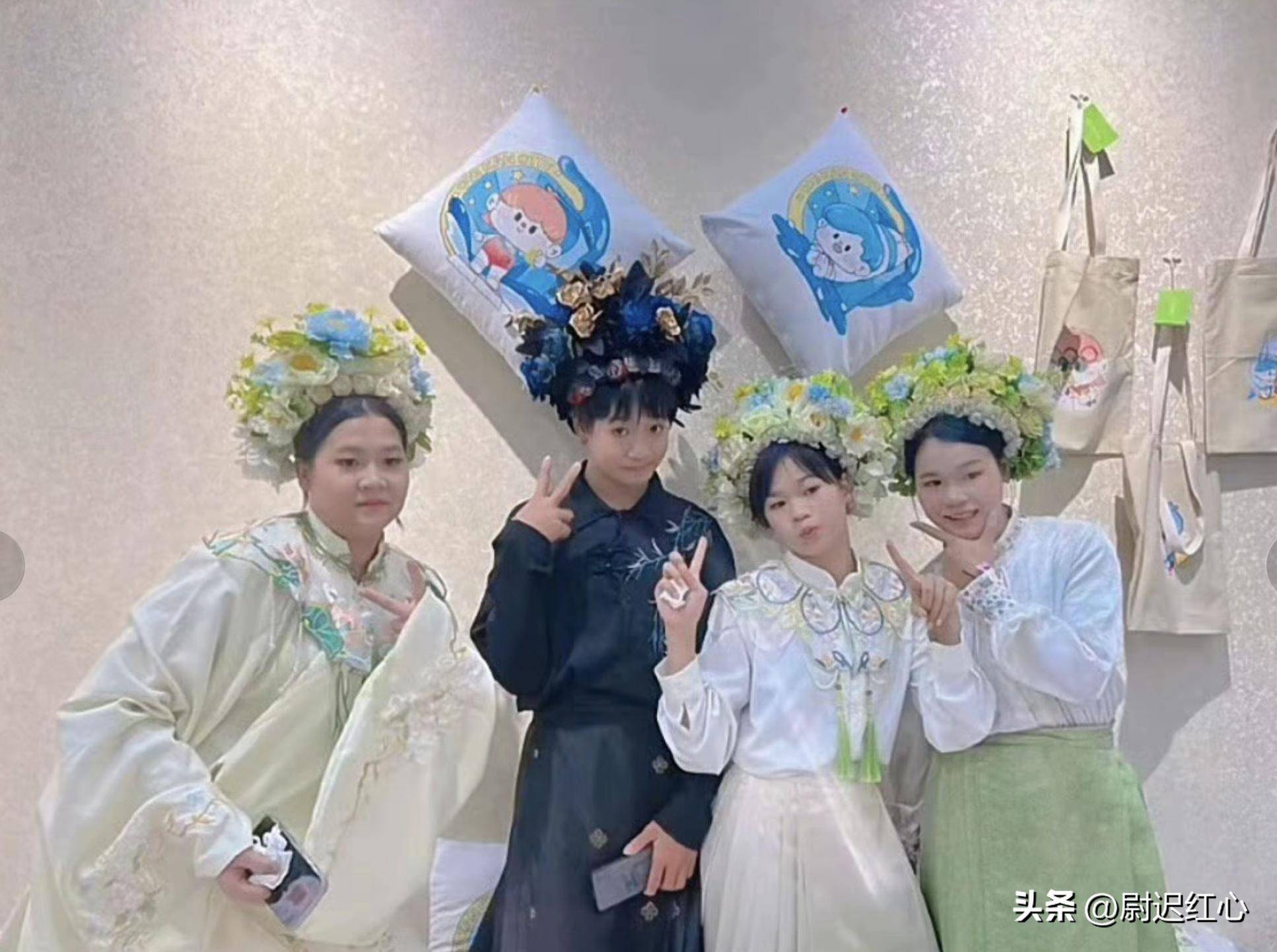 三姐妹都戴着一样的簪花,但穿的衣服不一样。她们三个站在一起,样子自然成了大家讨论的焦点。