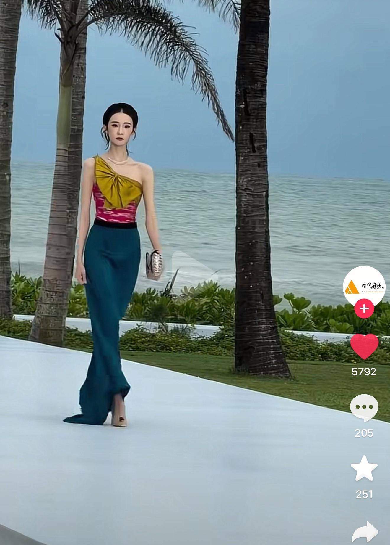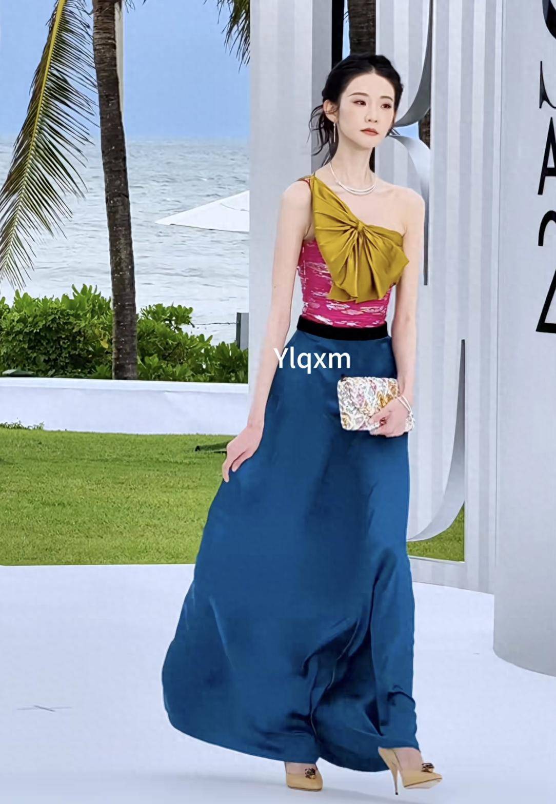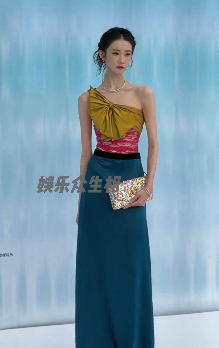 礼服讲真的,不太好看,湖蓝色的裙摆拼玫红色的抹胸,胸前还有一块黄色的皱巴蝴蝶结,但她的个子高,身材纤瘦,把六十分的衣服穿出了九十分的味道来。