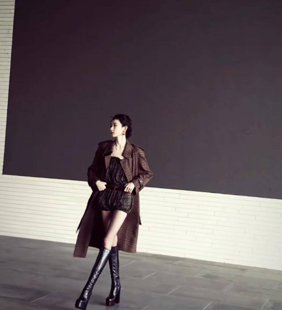 另一套则是Saint Laurent千鸟格大衣配高筒长靴,复古与现代感兼具。