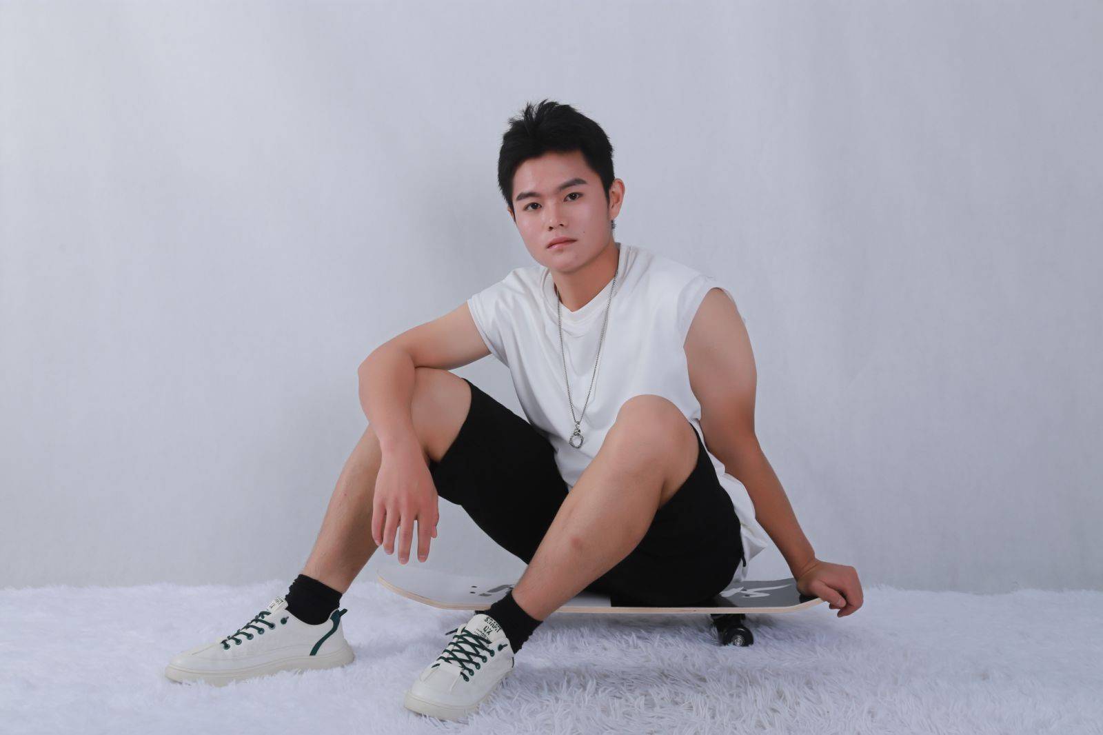 当镜头对准邹岭辉,你很难用单一标签框定这个刚踏入模特圈的少年 —— 他身上没有刻意雕琢的成熟,却藏着青春最本真的可塑性:一件黑色肌理感 T 恤搭水洗牛仔,松弛地陷在皮质沙发里,袖口垂落的弧度裹着漫不经心的慵懒,像傍晚天台吹风的邻家男孩,自带不费力的松弛感;而当他换上无袖白 T,银链垂在锁骨的冷光撞上滑板的街头锐气,又成了潮牌橱窗里最鲜活的少年野心。