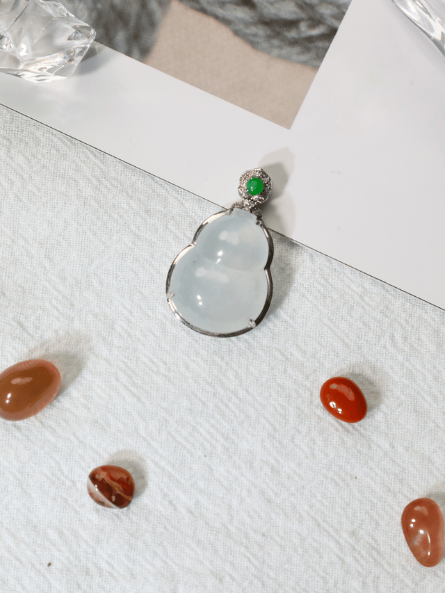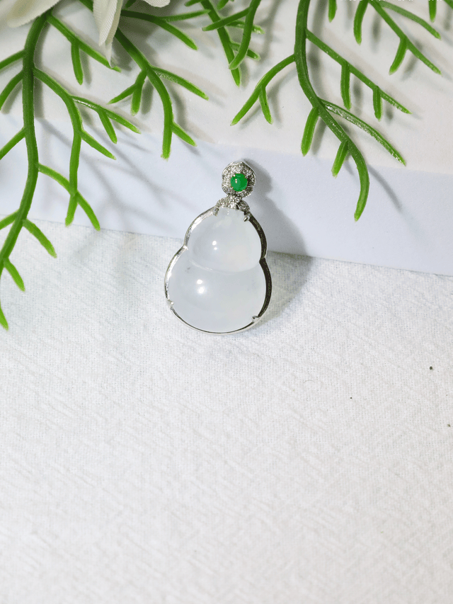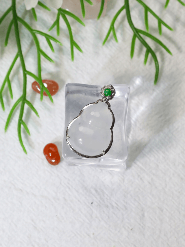 精致的镶嵌工艺更是为吊坠增添了几分华丽。闪耀的贵金属,如同忠诚的卫士,紧紧环绕着那冰清玉洁的翡翠葫芦,既凸显了翡翠的高贵,又增添了整体的时尚感。
