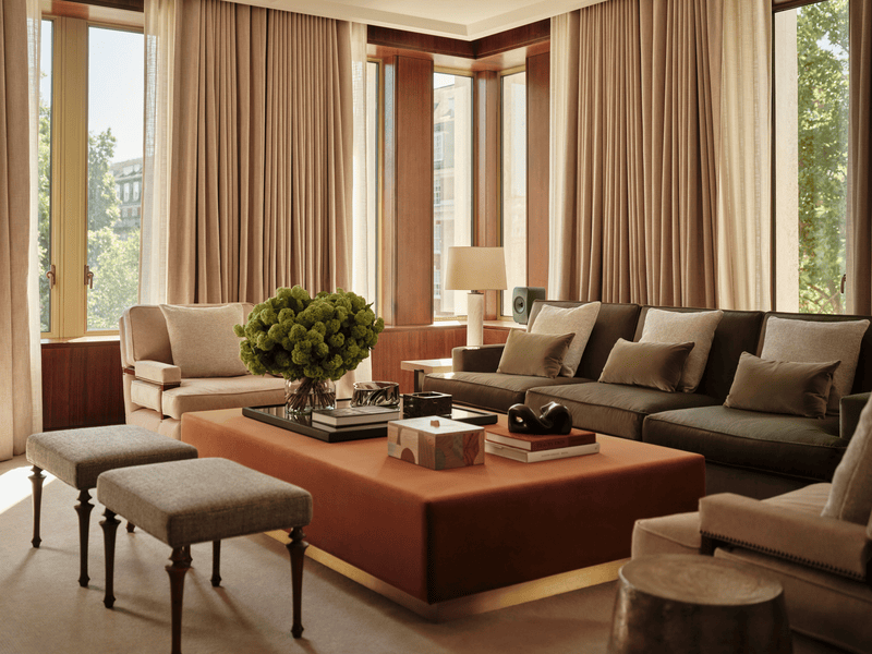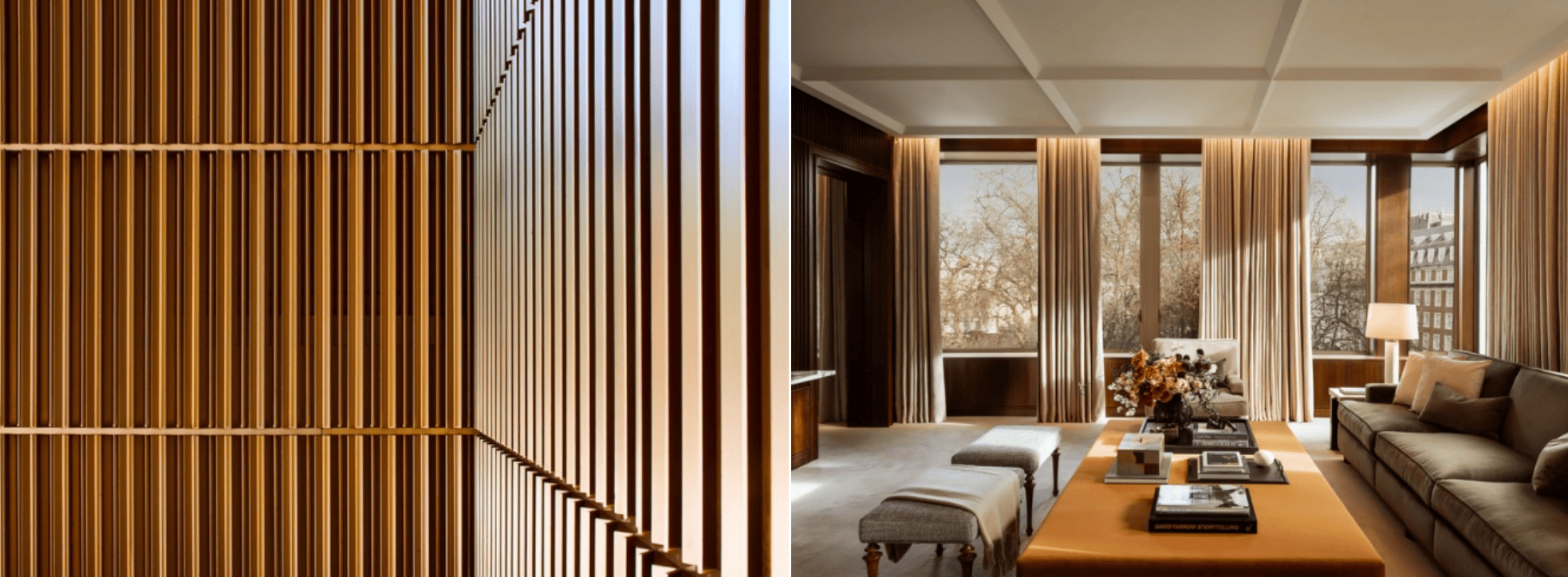 伦敦梅费尔瑰丽酒店配置 144 间精心设计的套房,室内设计由法国建筑师 Joseph Dirand 担纲。这位提倡极简主义风格的建筑师以酒店原始的、棱角分明的外观为底,辅以纯粹且优雅的设计笔触,呈现出现代风格与奢华质感相得益彰的内部空间。在氛围营造上,设计师采用温暖丰富的色调,并融入精致的装饰艺术风格细节、胡桃木镶板以及大理石和黄铜装饰,营造出传统英式绅士俱乐部的氛围。