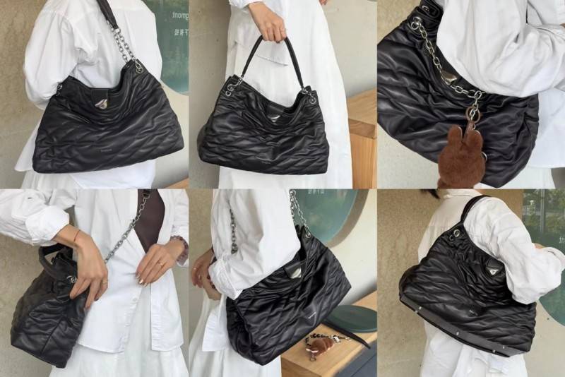在功能结构上,此款托特包提供小号与中号两种尺寸,分别可容纳11寸iPad与14寸笔记本电脑,满足不同负载需求。内部设专用挂载位,可妥善安置墨镜等易损物品;可调节拆卸的链条肩带搭配泡芙感肩托,有效分散肩部压力,并能解锁腋下、单肩、斜挎、手拎等多达六种背负方式。无论是日常通勤、差旅外出还是周末休闲,它都能以出色的包容性与灵活适配性,成为名副其实的“实用王者”。