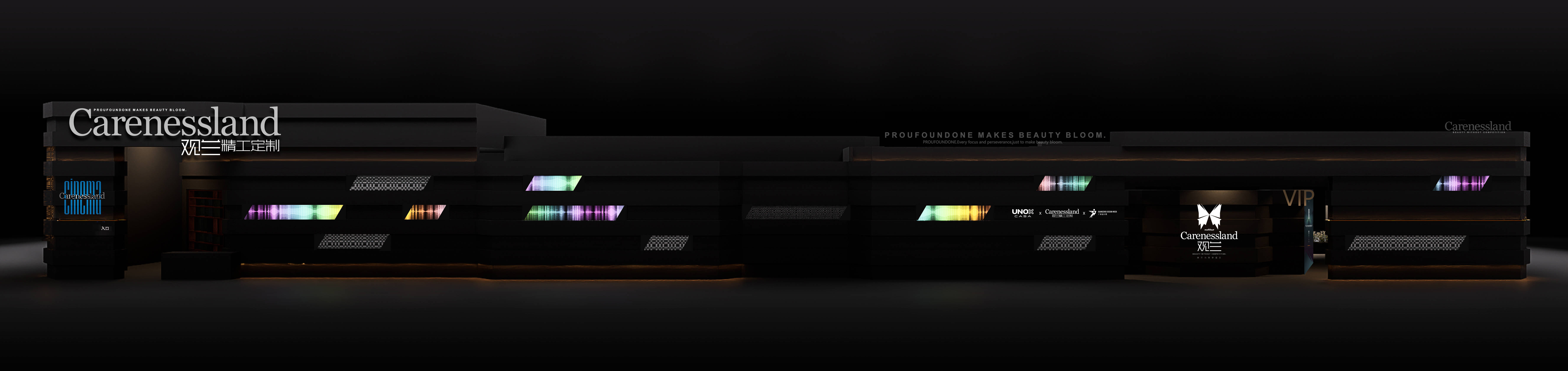 展厅由尺度设计创始人沈健操刀,展会期间会客厅的活动由之外设计创始人邓丽司策展,整体以“外呈丰繁,内守纯粹”为设计理念。外部建筑灵感源于观兰经典产品“宝丽合”的八角形态,层叠盒体象征四季轮回,LED光影动态演绎品牌标志性视觉符号“观兰格”,构建流动的视觉秩序;内部则回归极简与静谧,以纯粹背景衬托产品的工艺与质感。
