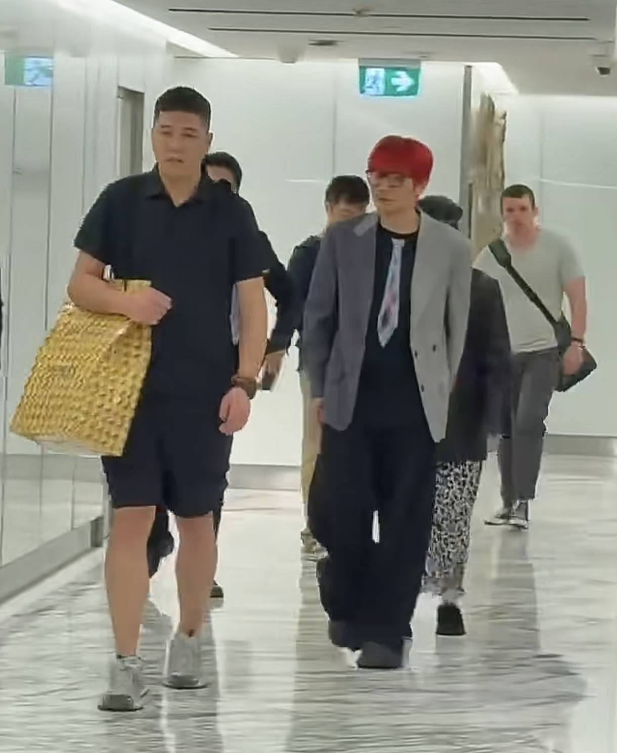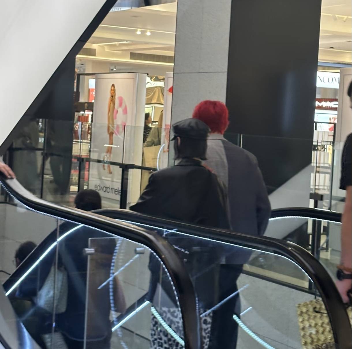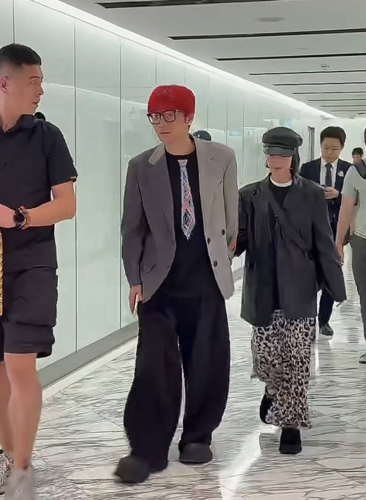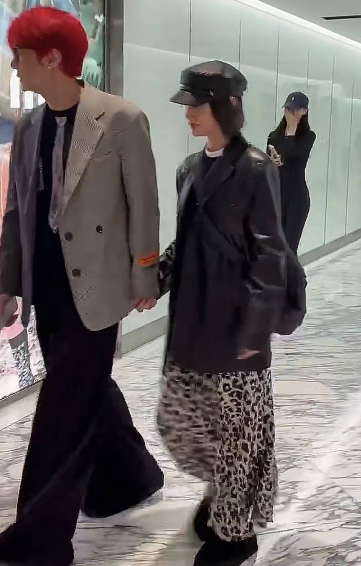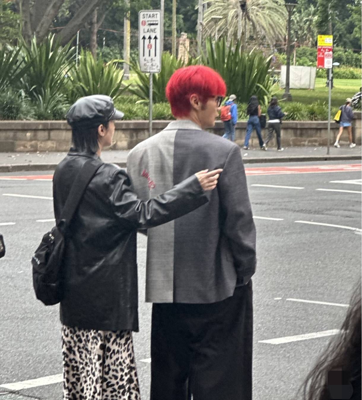 那天在悉尼街头,李荣浩顶着一头火红头发,穿着拼接西装,双手插兜往那儿一站,活像从漫画里走出来的男主角。这造型放在人群里,想不显眼都难,简直像万绿丛中一点红。而身边的杨丞琳更是时髦精本精,黑色皮衣配皮帽,下身搭了条野性十足的豹纹裙,脚上居然踩着双黑色拖鞋——这种“我随便穿穿就比你会打扮”的劲儿,确实很杨丞琳。
