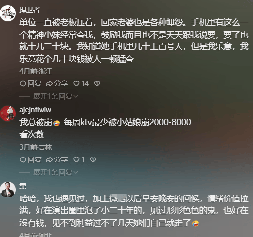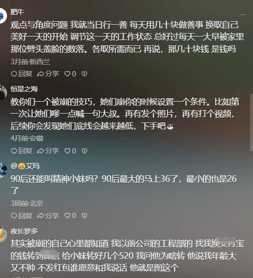 还有网友说:被两个小女孩崩过。观点与角度问题,我就当日行一善,第一次请她们俩,这俩跟没吃过饭一样,点了一桌子,结果结账发现才65块,边吃还边嗲嗲的喊自己哥。每天用几十块做善事,换取自己美好一天的开始,调节这一天的工作状态,总好过每天一大早被家里那位劈头盖脸的数落。各取所需而已!再说,那几十块钱,是钱吗?