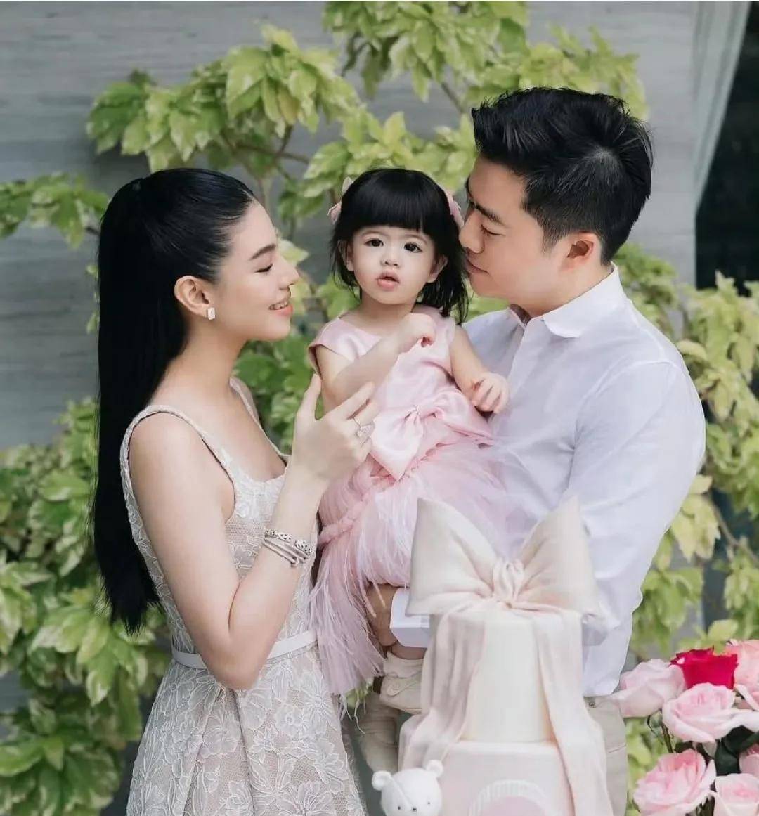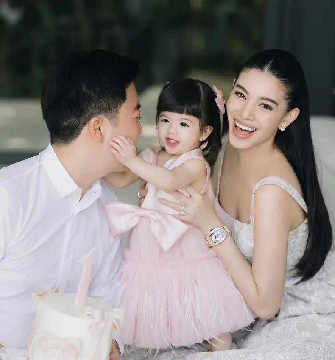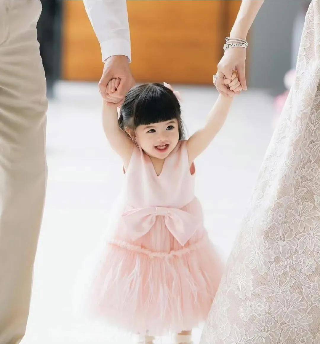 Kat穿着米白色蕾丝长裙,简单扎着马尾,手上的戒指和腕表显得十分精致。她的丈夫穿着同色系衣裤,抱着穿粉色公主裙的女儿。小女儿头发乌黑浓密,皮肤白皙,完美继承了妈妈的优点。