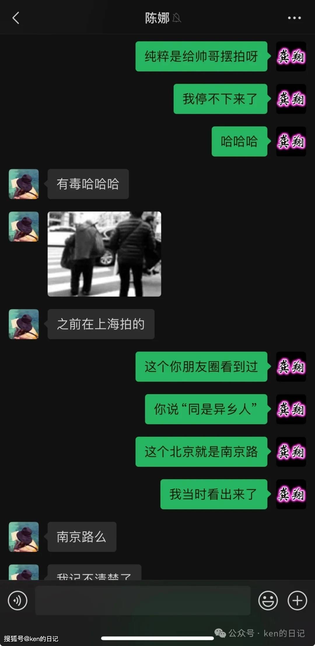 随后为了掩饰自己犯花痴的真相,陈娜发来一张自己以前来上海,逛南京路的时候,拍了一张照片,也是黑白色调,这张照片是一个老人,一个男人,一起过马路的样子,这张照片,我觉得没有突出什么想要表达的,但是我看过她朋友圈分享过这张照片,她当时取名是“同是异乡人“。所以我就用了这个词接话,因为我确实不知道想表达什么。