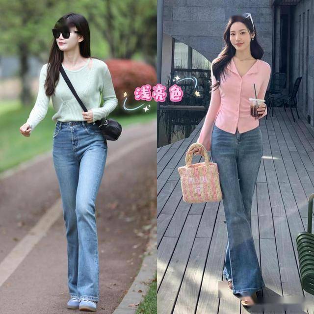 酒杯裤的颜色一般都很基础,最常见的有丹宁蓝和黑色,所以挑选上衣的时候,颜色可以丰富一点,选择浅亮色,既可以打破单调感,又能成功转移视线。