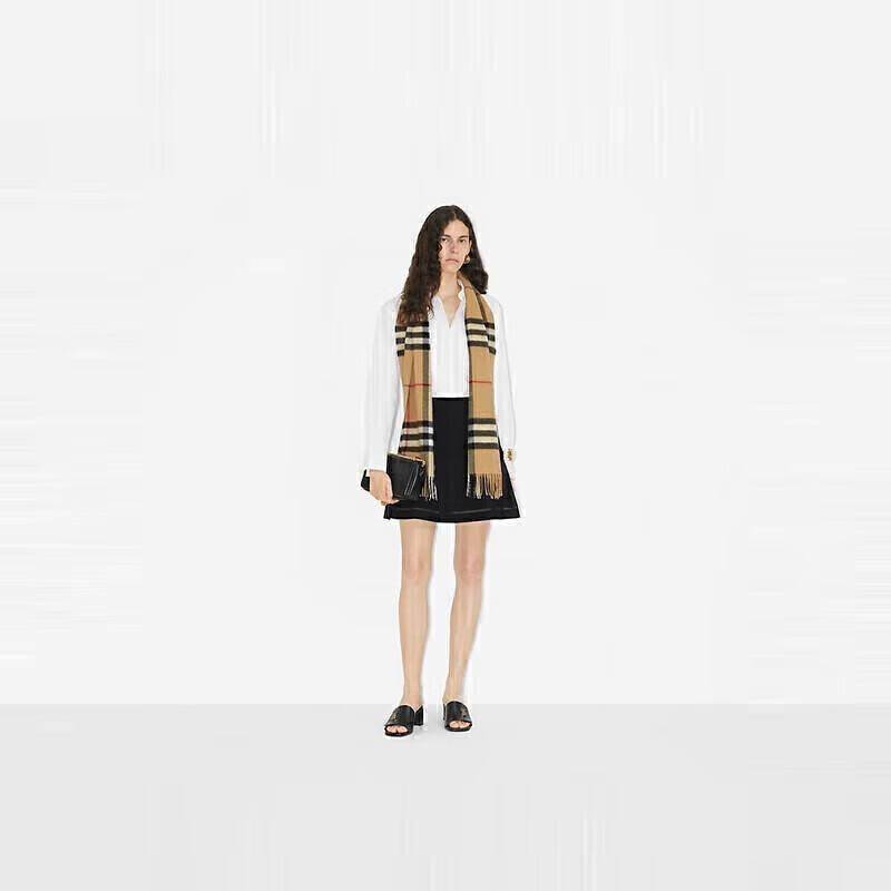 博柏利格纹羊绒围巾的每一根纱线都在诉说百年工艺的坚持。采用100%苏格兰高山羊绒,纤维直径仅14.5微米,比普通羊毛柔软3倍以上。标志性蜂蜜色格纹经过72道工序织就,每英寸精确编织120针,既保留传统英伦气质,又通过现代提花技术让图案立体饱满。
