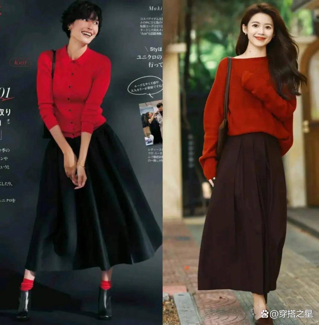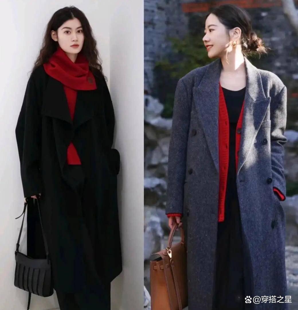 想要气场强一点,红黑配绝对是首选。黑色的沉稳和红色的热烈碰撞在一起,就像一场激烈的交响乐,既压得住场子,又不会显得沉闷无趣。比如穿一件宽松的红色大毛衣,下面搭一条利落的黑色缎面直筒裙,明暗对比强烈,整个人显得特别干练、飒爽。再踩一双黑色低跟鞋,贵气感直接溢出屏幕,妥妥的“大女主”气场。
