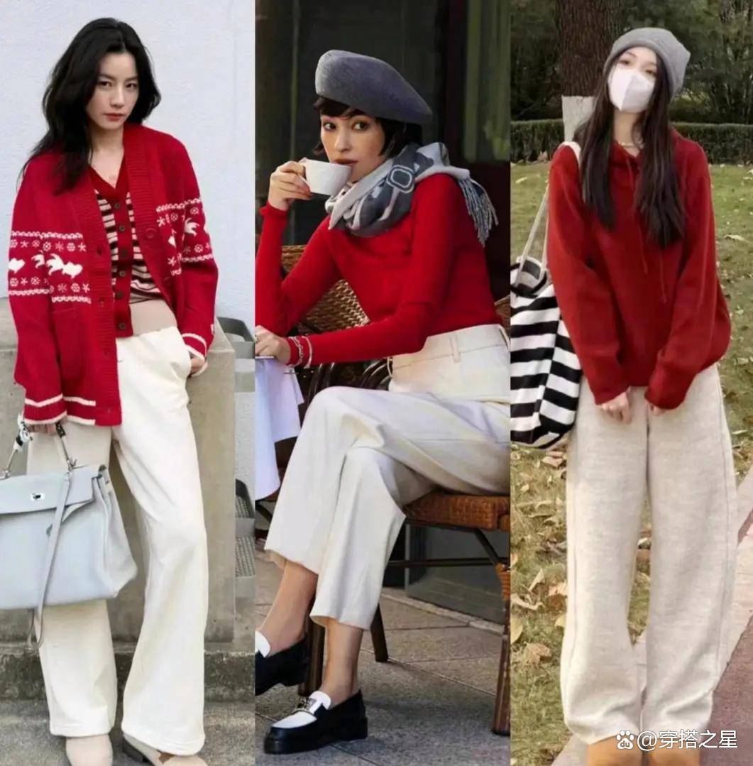 冬天想穿得干净清爽,红白配必须安排上。白色的纯净简约,能提亮红色的明度,让整个造型看起来特别干净、灵动,就像雪地里的一把火,特别亮眼。最简单的方式就是搭配一条白色毛绒阔腿裤,瞬间就有种“富家千金”的贵气感,精致又减龄。过年过节走亲戚穿这身,亲戚都得夸你乖巧。