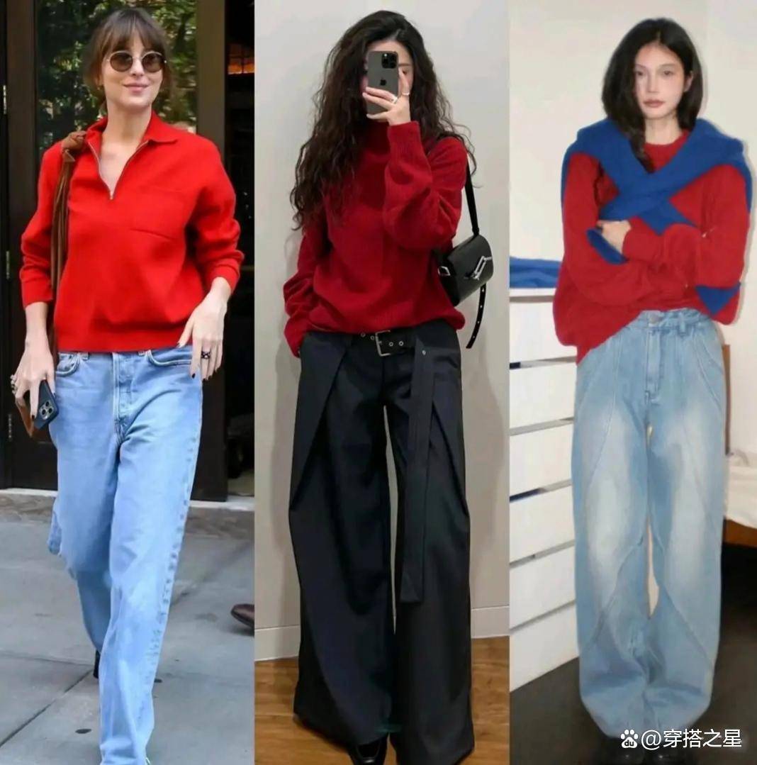 搭配红色毛衣,最省心的办法就是搭一条牛仔裤。红蓝撞色,就像冷色调和暖色调来了一场激情碰撞,视觉冲击力超强。而且,牛仔裤自带清爽休闲属性,能中和红色的张扬艳丽,又不会削弱造型的活力感。穿上这身,复古感直接拉满,仿佛穿越回了那个充满故事的年代。