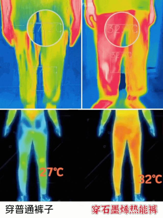 看!普通加绒裤表面温度27℃,穿咱们石墨烯热能裤,直达32℃!