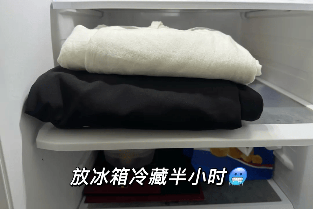 我们用冰箱模拟冬天环境,把它和普通裤子+保暖裤,分别裹住2瓶温度为45.9℃的热牛奶,然后放进冰箱~