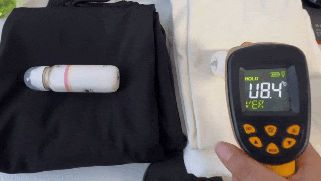半小时后再拿出来,普通裤里的牛奶,温度下降近15度,而热能裤里的牛奶,只下降了6度~