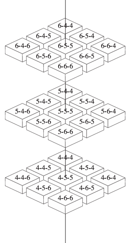 目前,一种广泛应用的数据分批方法是“555分色法”(如图所示)。该方法首先测量各布卷与标准色样之间的色差值,然后根据其偏离程度,为每个布卷赋予一个由三位数字组成的“555”编码。从原理上看,此方法是在三维颜色空间中,构建一个以标准色为中心点的参考立方体。该立方体在CIELAB (L*a*b*) 颜色空间中的三个维度分别对应:L*:明度、a*:红/绿值、b*:黄/蓝值