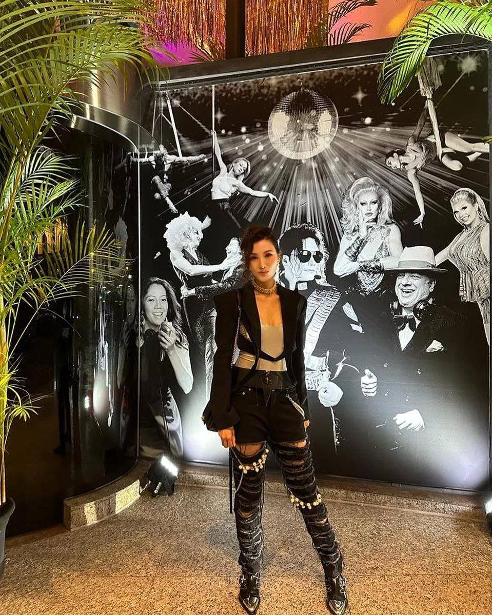 这身近照颜色倒是低调了,但李嘉欣的黑色皮裤配蓝紫色高跟鞋,皮裙配网纹靴,怎么看怎么迷~