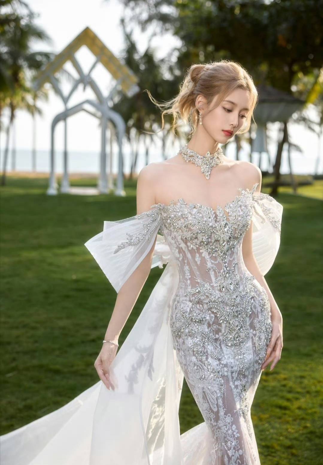 三亚婚纱时装周历来以华丽大拖尾、繁复蕾丝、璀璨头纱为标配,明星嘉宾也多选择符合“新娘”人设的甜美或端庄造型。然而徐艺洋的登场却彻底颠覆了这一传统:没有蓬松裙摆,没有夸张装饰,仅凭一条剪裁利落的缎面鱼尾裙,便将冷白皮与优越腰臀比展现得淋漓尽致。设计师透露,这条裙子的灵感源于“海浪与礁石的碰撞”,通过立体剪裁让面料自然贴合身体曲线,既保留了婚纱的圣洁感,又赋予其时装周所需的先锋气质。