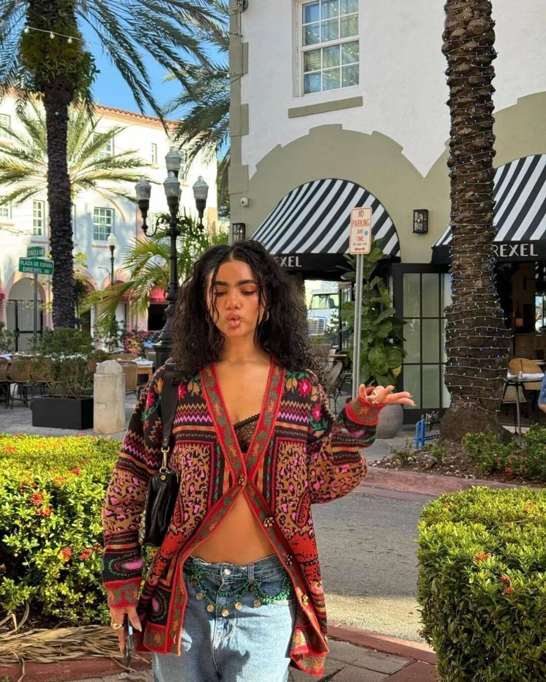 都市游牧风也可以年轻街头,且更富个性张力。民族印花自带天然的随性与松弛,当下与辣妹开衫的搭配组合将都市游牧玩出了截然不同的味道。既带有旷野的自由气息,又不乏锋利的时尚态度,使得这一穿搭模式开始备受年轻人追捧。