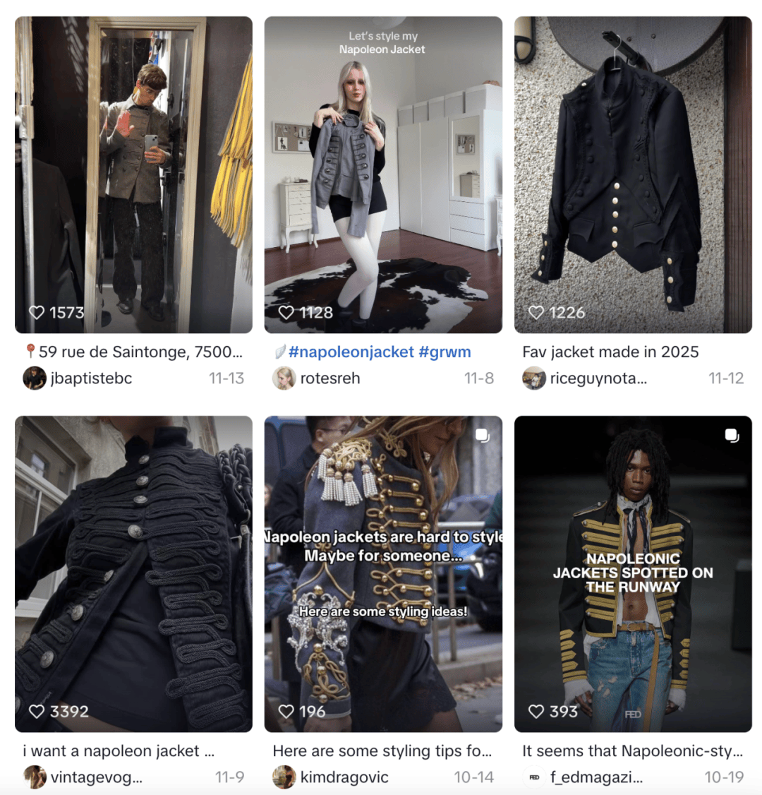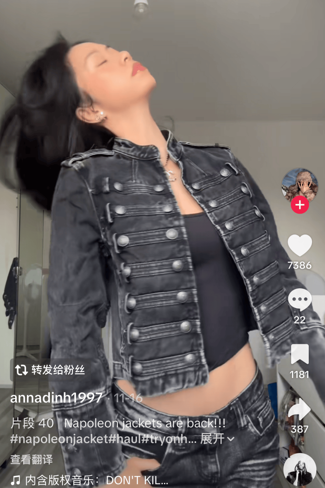 在 TikTok、Instagram 等海外社媒上不少时尚博主在视频里展示他们如何从古着店、二手市场、旧衣柜里挖出军装旧衣——有的是旧仪仗队制服,有的是 80、90 年代复刻版本。