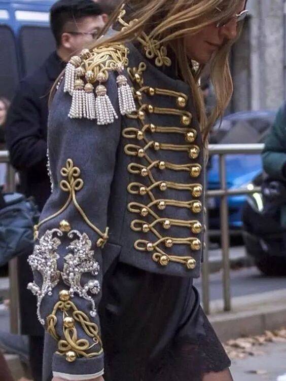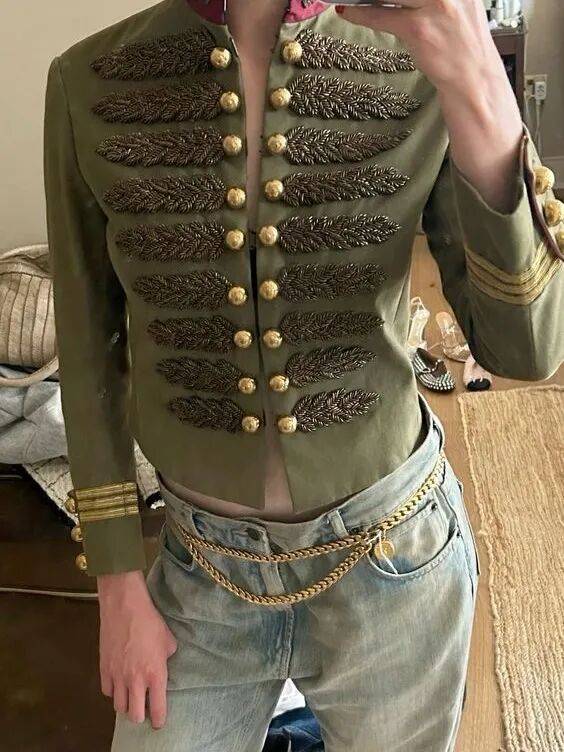 2025 年下半年,在国内二手、复古社群中“ Napoleon Jacket ”“ military jacket ” 这件带有金属扣、立领、肩章、frogging 辫绳扣饰的 “军乐队式夹克”,正以前所未有的速度被一批年轻人捡起。根据 Harper’s Bazaar Singapore 最新报道,这股回潮正在成为 25、26 街头与潮流圈的新趋势。
