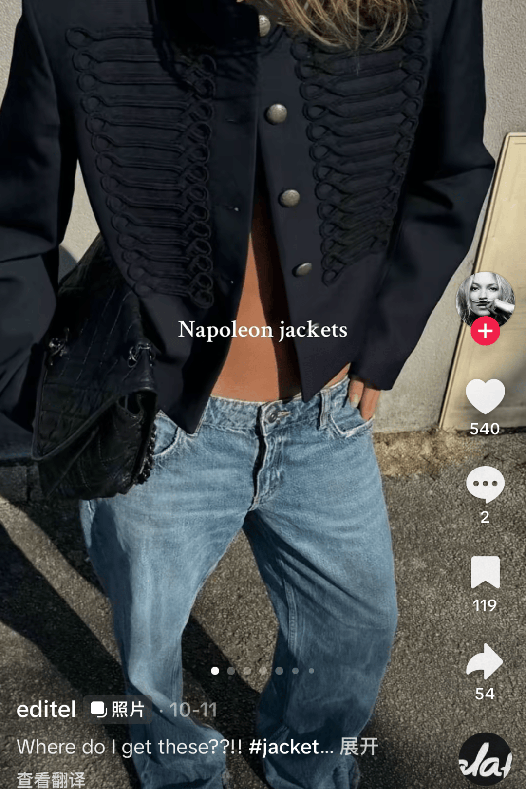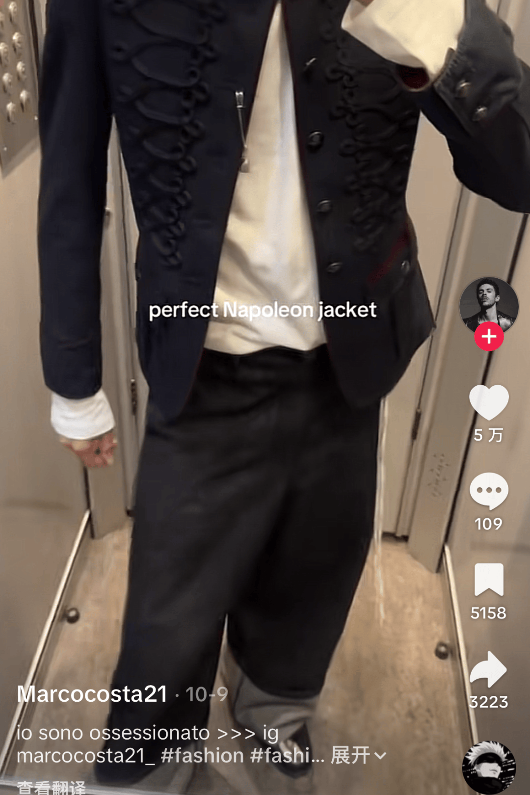 这种由社媒发酵、由年轻人主导的趋势,更像一次对“权力、美学、身体语言”的重构。通过穿上一件拿破仑夹克,佩戴者似乎不只是想“好看”,更像在“戴上一种姿态”,一种介于历史、权力、身体与街头的复杂符号。