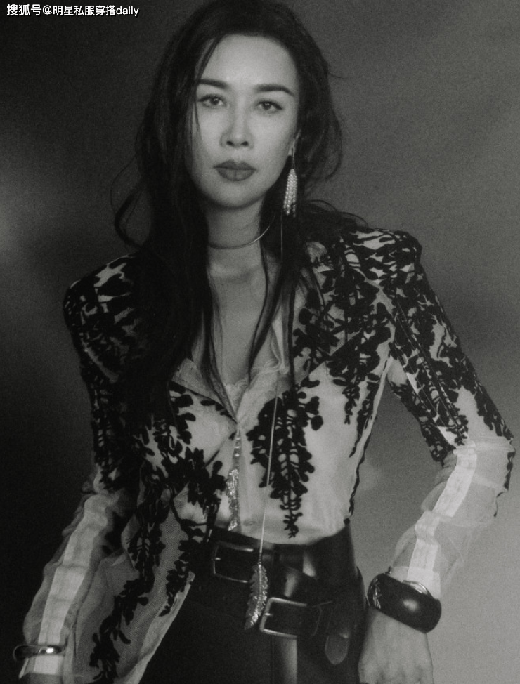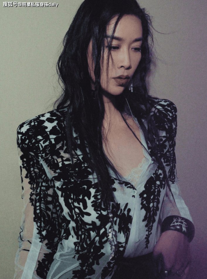 和这件蓝色透视感蕾丝立体花朵装饰的衬衫相呼应衬,层次感拉满,从在视觉上丰富了穿搭的色彩,让那英整个人看起来气质更加高级。