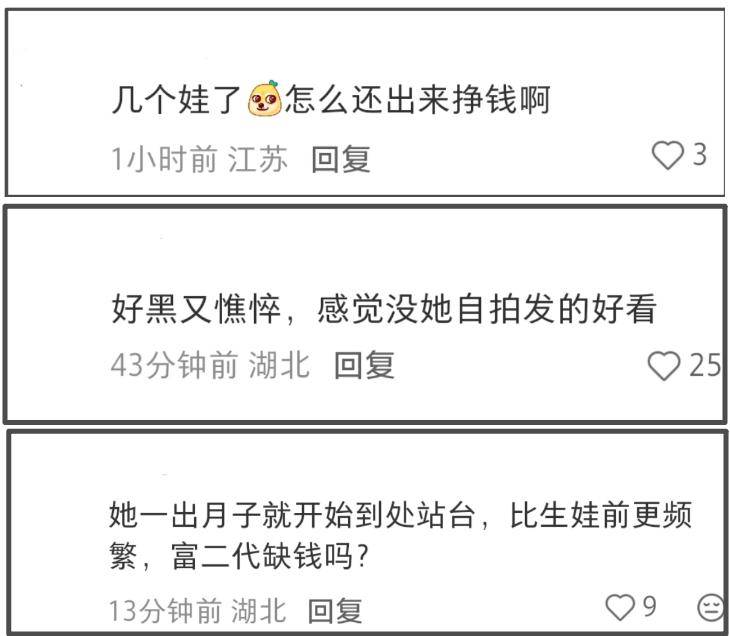 她生孩子后急于复出走穴,参加了几次活动替品牌方站台,但头衔都不高,新剧资源也一般,前几天又进组演起了四番女配。