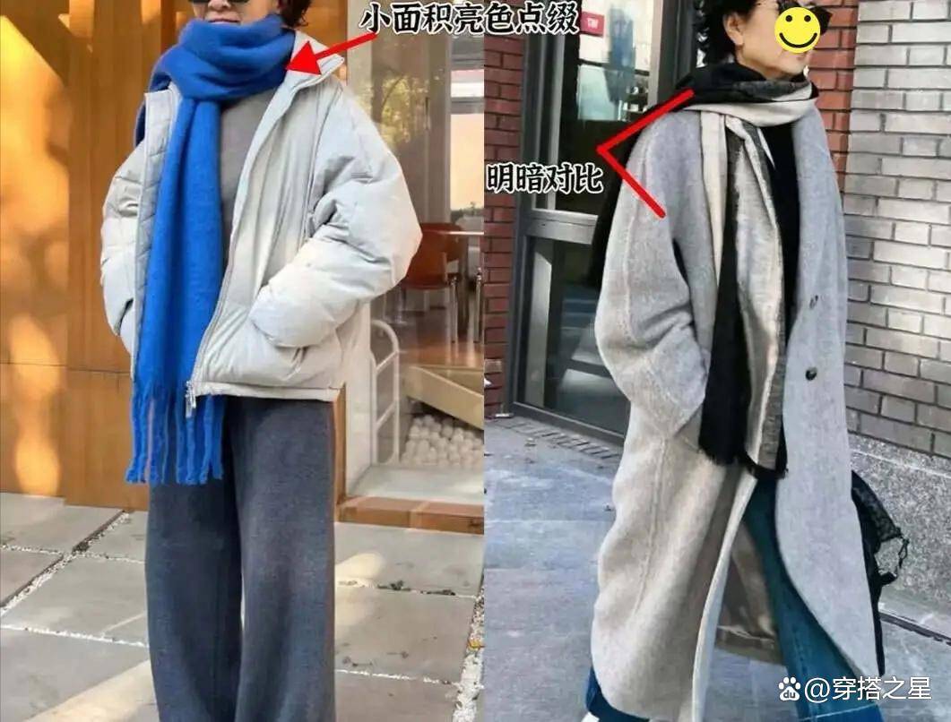 举个例子,像图中这两组穿搭,衣服颜色基础,就搭上亮色系的围巾,占比面积小,却能让穿搭有对比、有层次,这就发挥出了亮色在穿搭中的作用。
