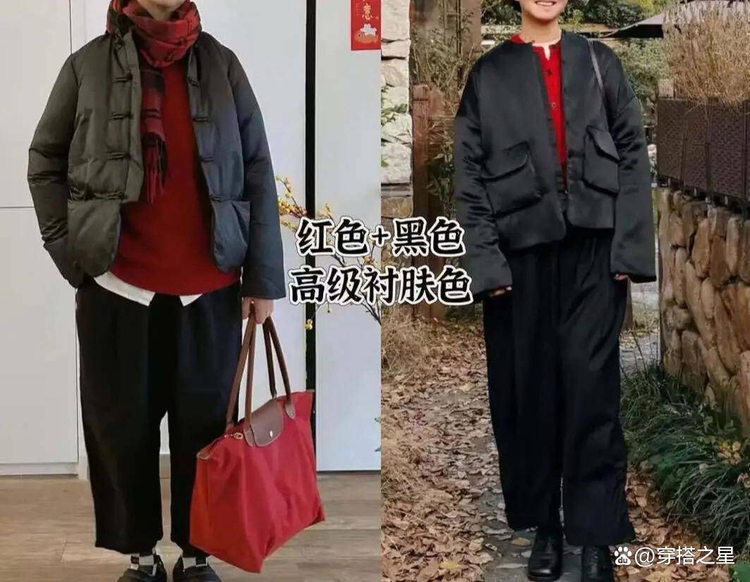 想让中老年女性不穿黑是不可能的,毕竟黑色显瘦又耐脏,出门随便一套就行了,因此,在这里,很推荐大家在穿黑色时,可以叠加红色,面积不需太大,像这位时尚博主一样,选一件内搭即可,二者存在于一个造型中,既能缓解黑色的沉闷,又能中和红色的高调。