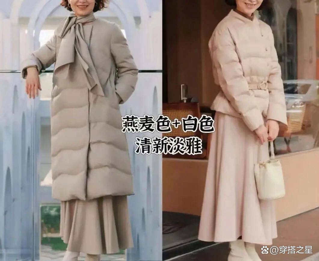 除了两组基础配色外,燕麦色与白色的组合,也是很值得中老年女性选择的,但不要看着这两者都属于浅色系,可却不影响对肤色的提亮效果。
