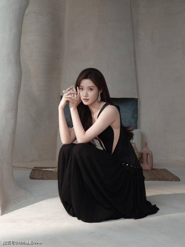 露背设计展现蝴蝶骨的精巧曲线,蹲坐姿态却如孩童般纯真。背景中的陶罐与编织垫暗合她私下的审美偏好——逛美术馆、收集手作器物是她减压的方式。这份“生活滋养时尚”的哲学,让她即使置身极简场景,也能用背影诉说万千情绪。