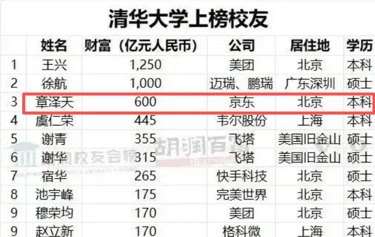 2024年1月,胡润研究院发布《胡润校友会榜》,章泽天以 600 亿身家位列清华校友富豪榜第三,仅次于王兴、徐航