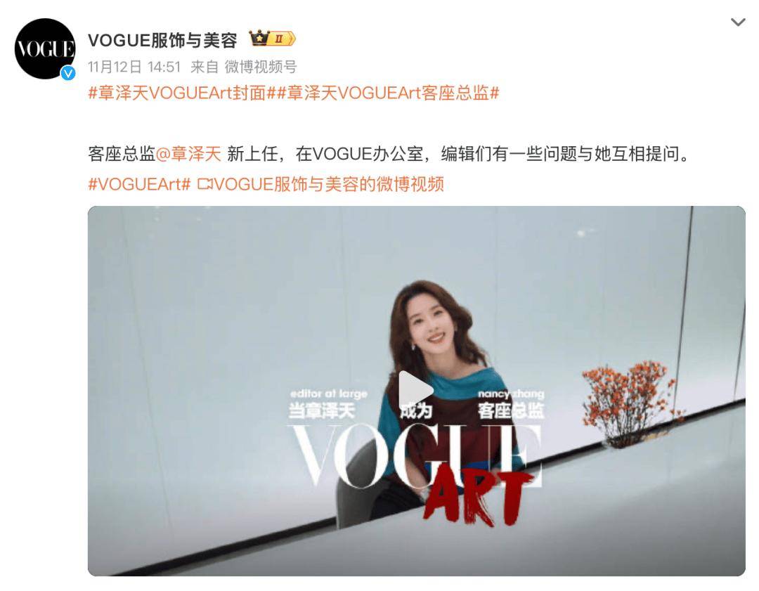 11月12日 “VOGUE服饰与美容”发布消息称:章泽天登上最新一期VOGUEArt封面,并担任VOGUE客座总监。