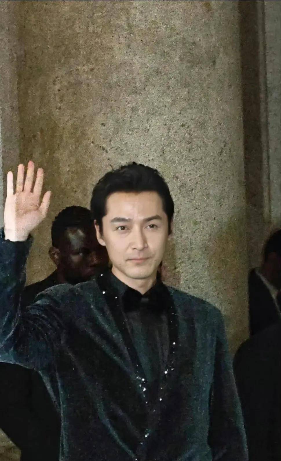 利落的盘发完美衬托出她精致的脸庞,对新中式礼服的演绎堪称东方美学的典范。与她同场看秀的胡歌同样令人惊艳,细闪纹样西装搭配经典背头,宛如《繁花》中的宝总穿越到米兰洽谈商务,尽显儒雅风范。