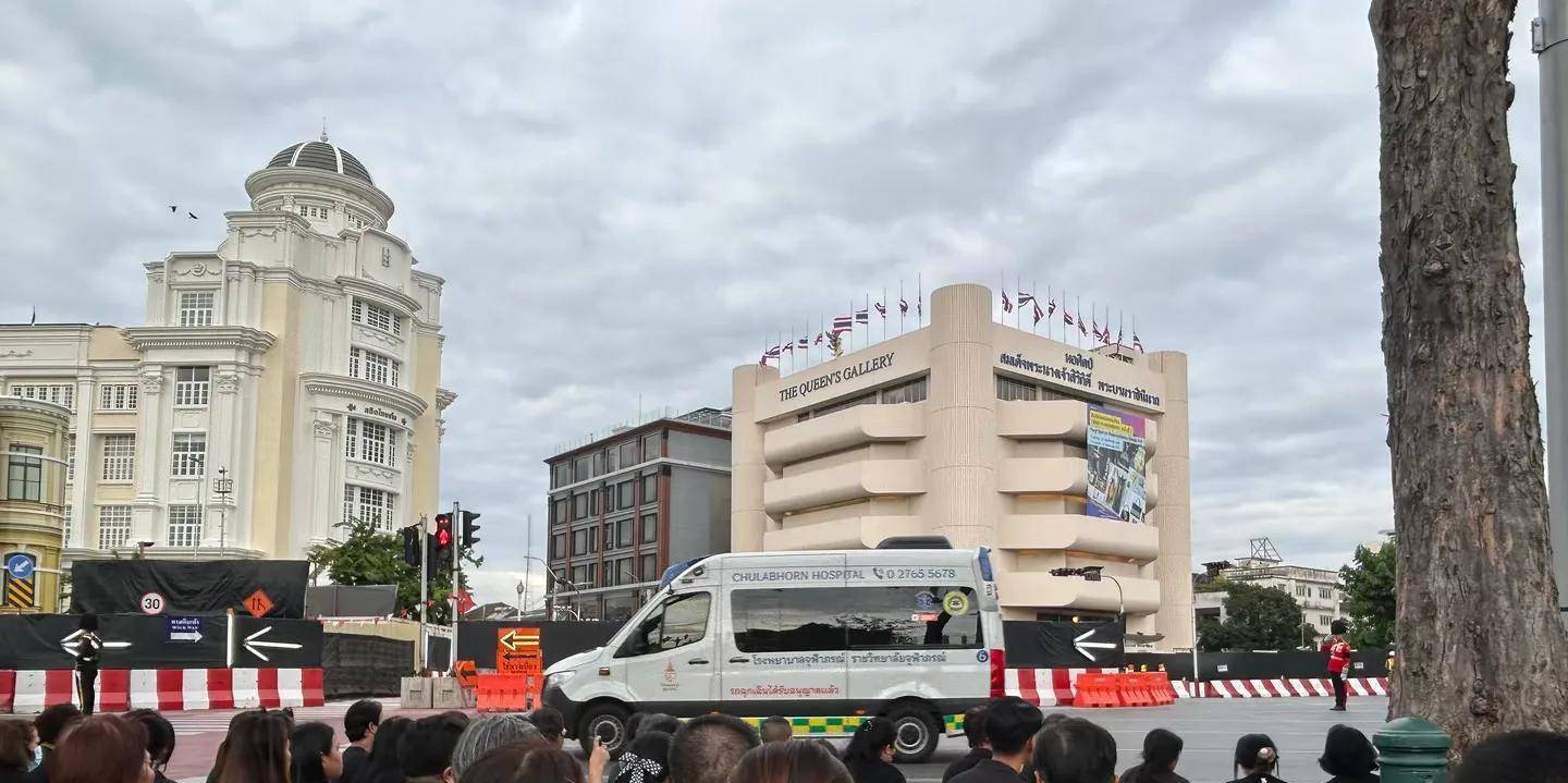 十月廿六日,载着诗丽吉王太后灵柩的车队从朱拉隆功医院缓缓驶出。值得注意的是,灵车正是先王拉玛九世生前座驾,王室成员紧随其后,场面庄重肃穆。