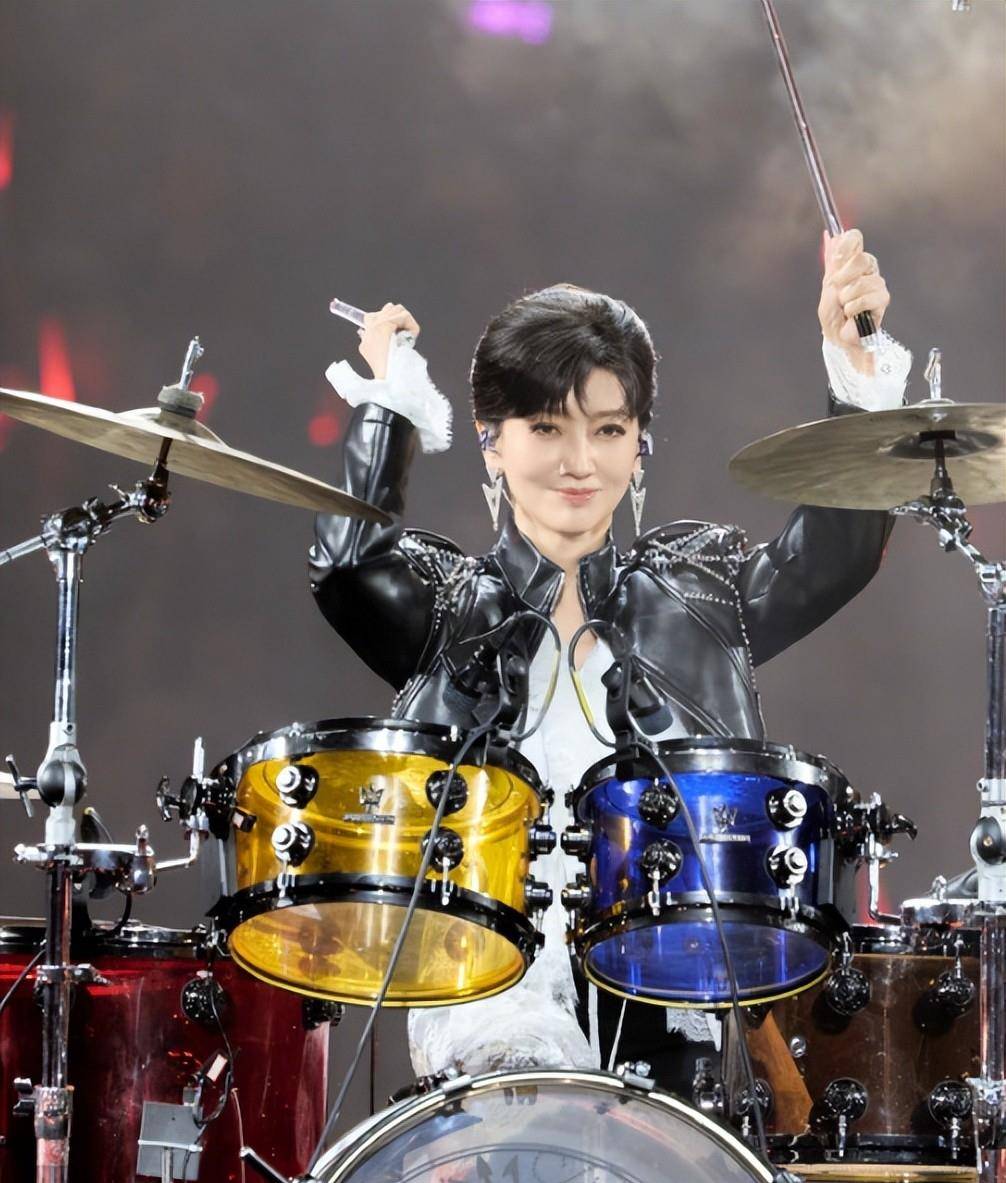 但这位经典美人偏要打破常规!庆生派对上秒变摇滚女王,铆钉皮衣搭配狂野鼓棒,即兴上演震撼全场的架子鼓solo。