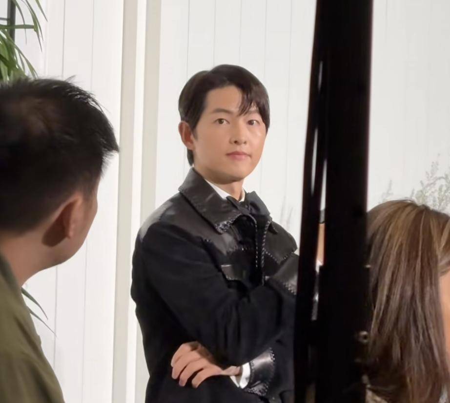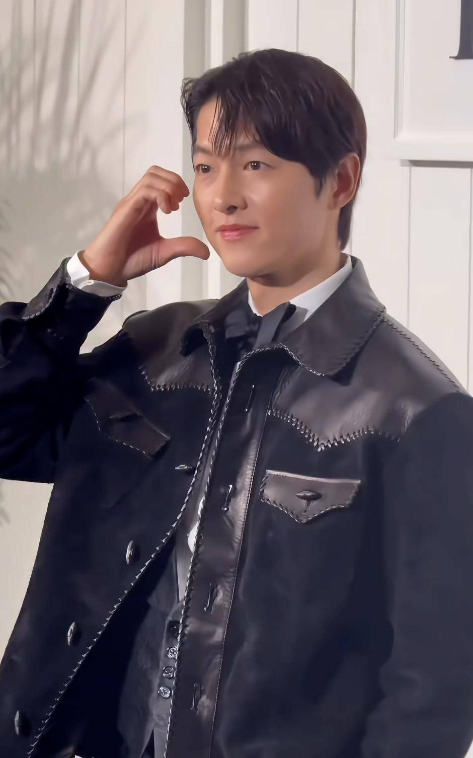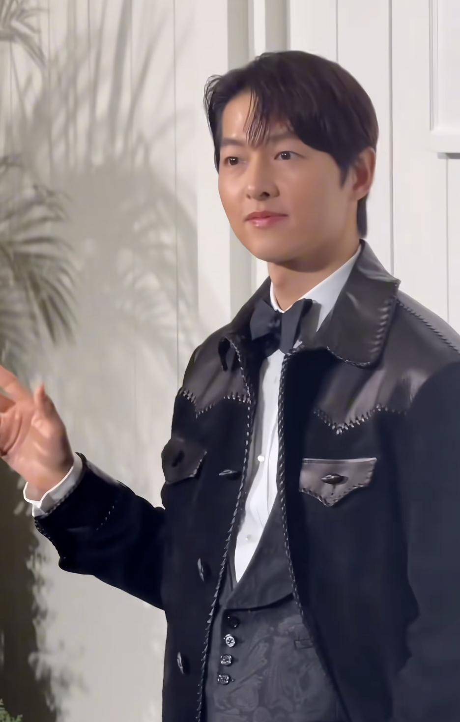 当晚同样抢镜的,是迈入40岁的宋仲基。衬衫马甲搭配夹克的造型远看尚可,但镜头推近时,那个湿发背头造型实在让人捏把汗。