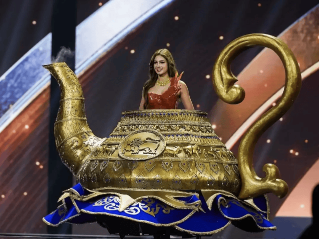 可海峡对岸的斯里兰卡小姐的造型就有点辣眼了,虽然是希望展现自己的故乡的茶文化,但是直接穿一个茶壶在身上真的有点太夸张了。
