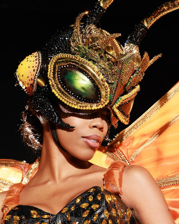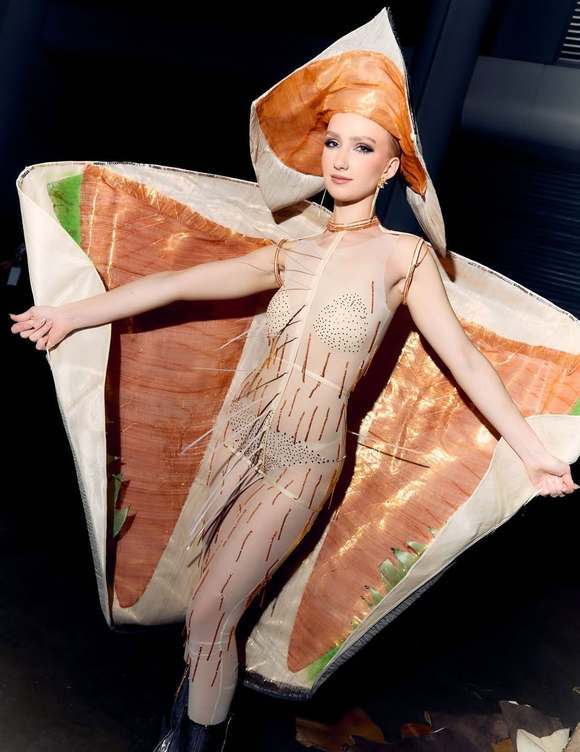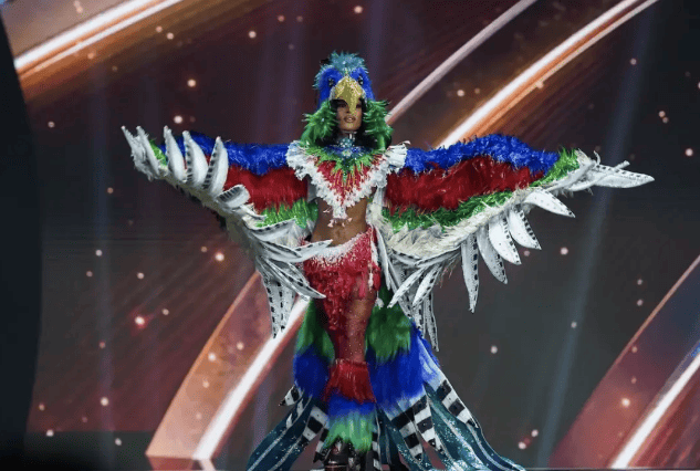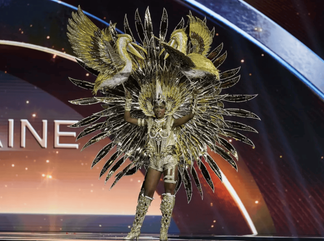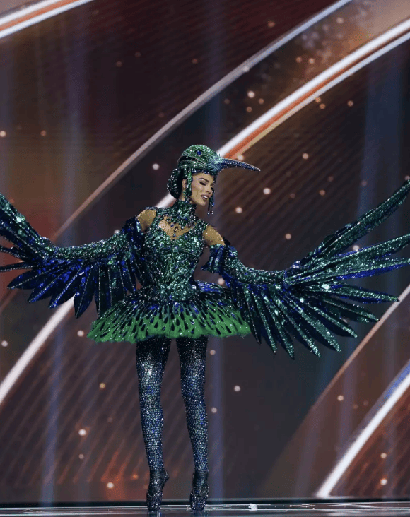 而在整个选美比赛中造型最获好评的其实也是以鸟类形象呈现的,比如在不少博主处打分最高的圣卢西亚佳丽,将自己打扮成一只蜂鸟:水晶紧身衣、绿色蓬蓬裙、头盔式鸟嘴头饰,配上她本职是芭蕾舞者,一路踮着足尖在T台上呈现也丝毫不吃力,真的把形体和元素展示融为一体了。