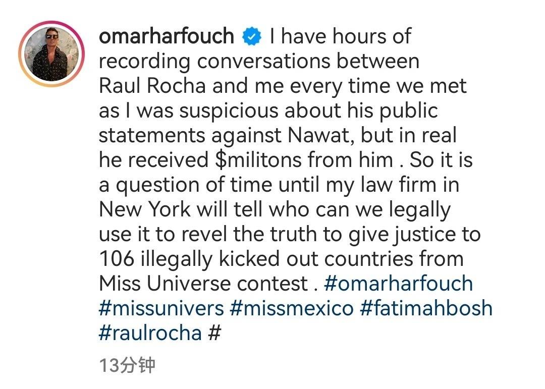 奥马尔·哈福什还爆料,法蒂玛的父亲与赛事主席劳尔·罗查·坎图存在商业往来,双方曾签订一项价值高达4300万美元的合同,甚至有传闻说法蒂玛与主办方老板同样”关系亲密“。