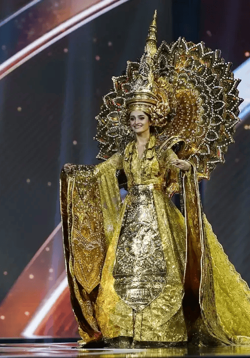 印度小姐的服装致敬了佛陀在菩提树下悟道的瞬间,整身金色礼服,圆形背板像一轮光环,象征了智慧与觉醒,这身造型的评价同样不错。
