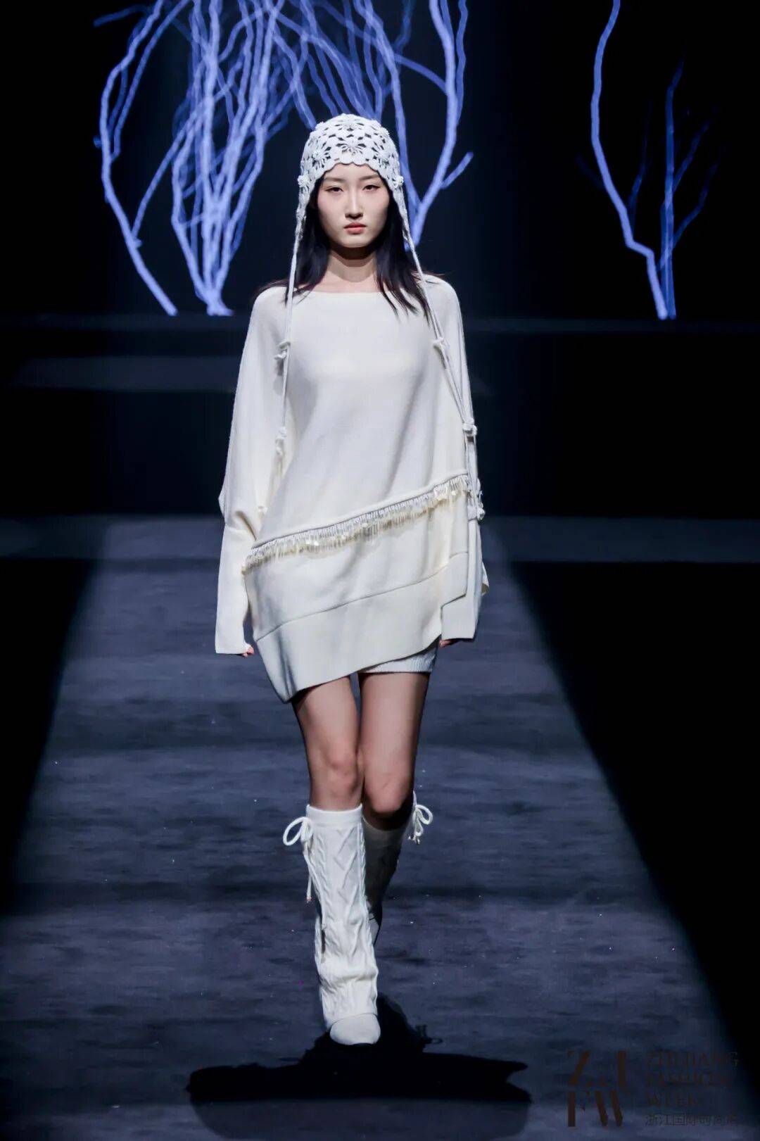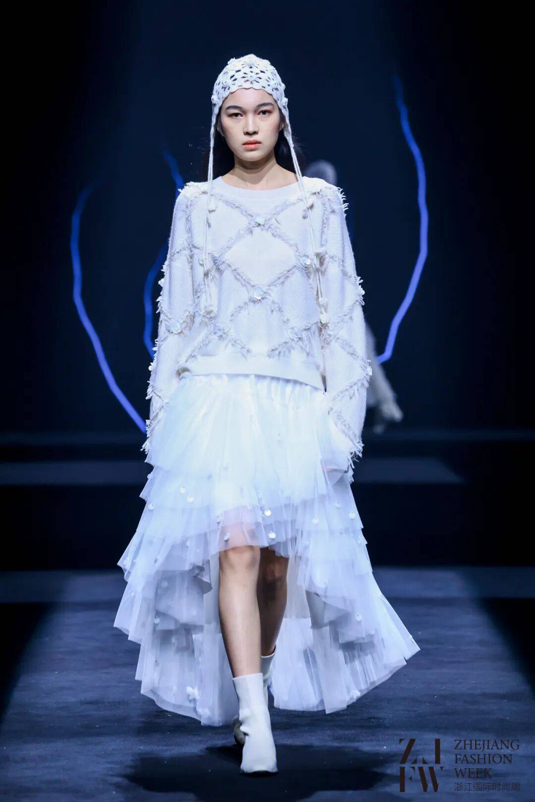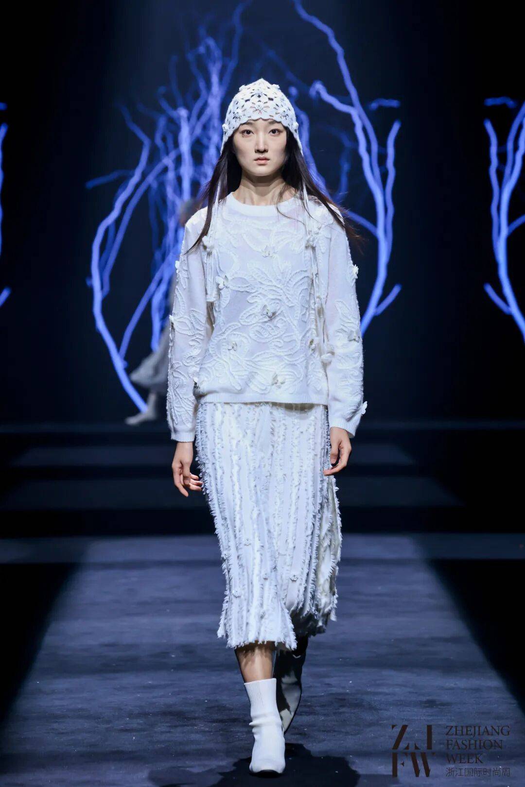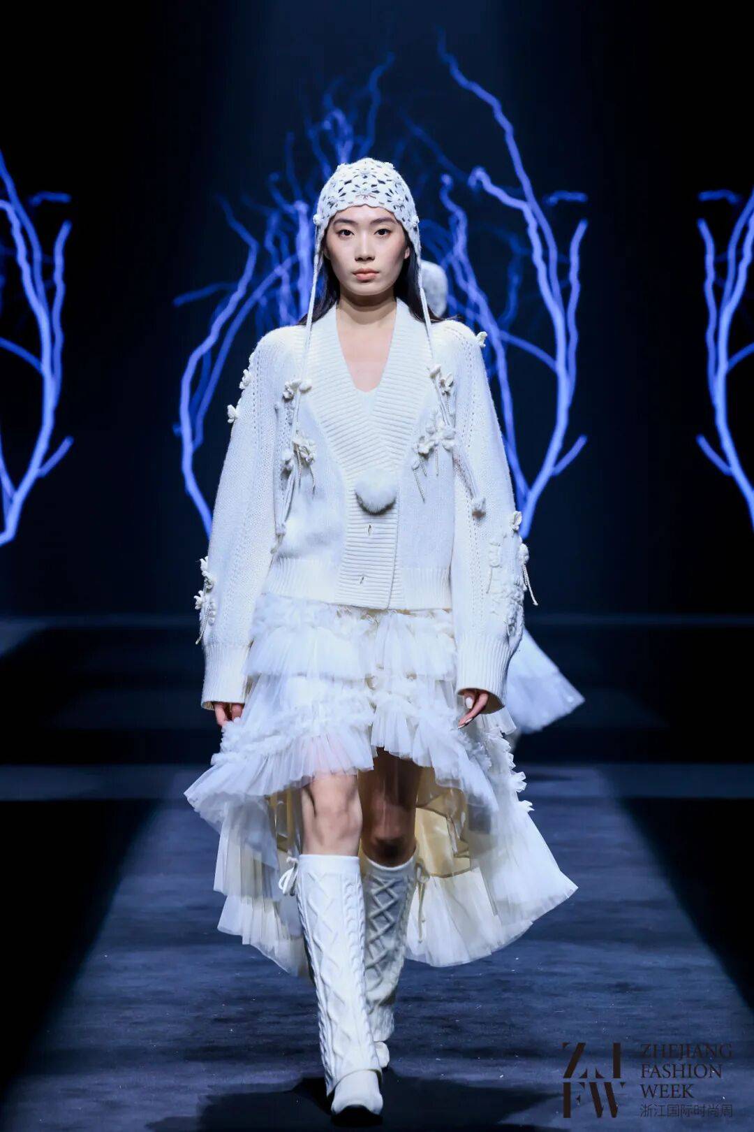 设计亮点:色彩上以米白为基调呼应年度代表色“云上舞白”,复刻冬雪初融景象;工艺上用电脑横机技术实现针织衫肌理从紧实到疏松的渐变,模拟积雪消融的触感;单品融入流苏、羽毛、亮钻元素还原雾凇、碎冰等自然景象,搭配不规则下摆半裙与手工钩织立体花朵,兼具时尚感与浪漫感。