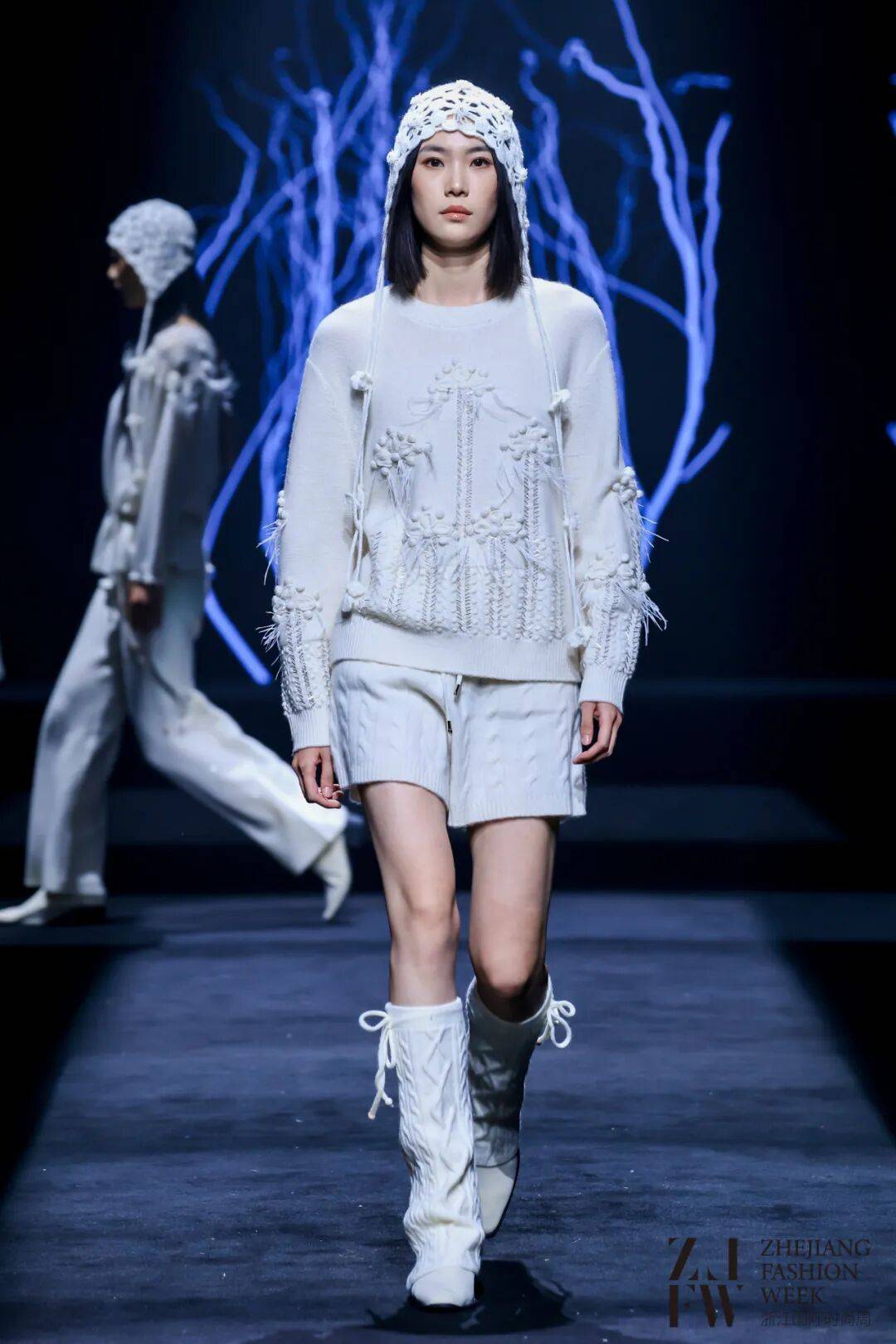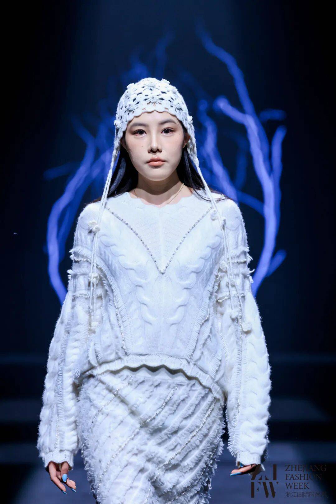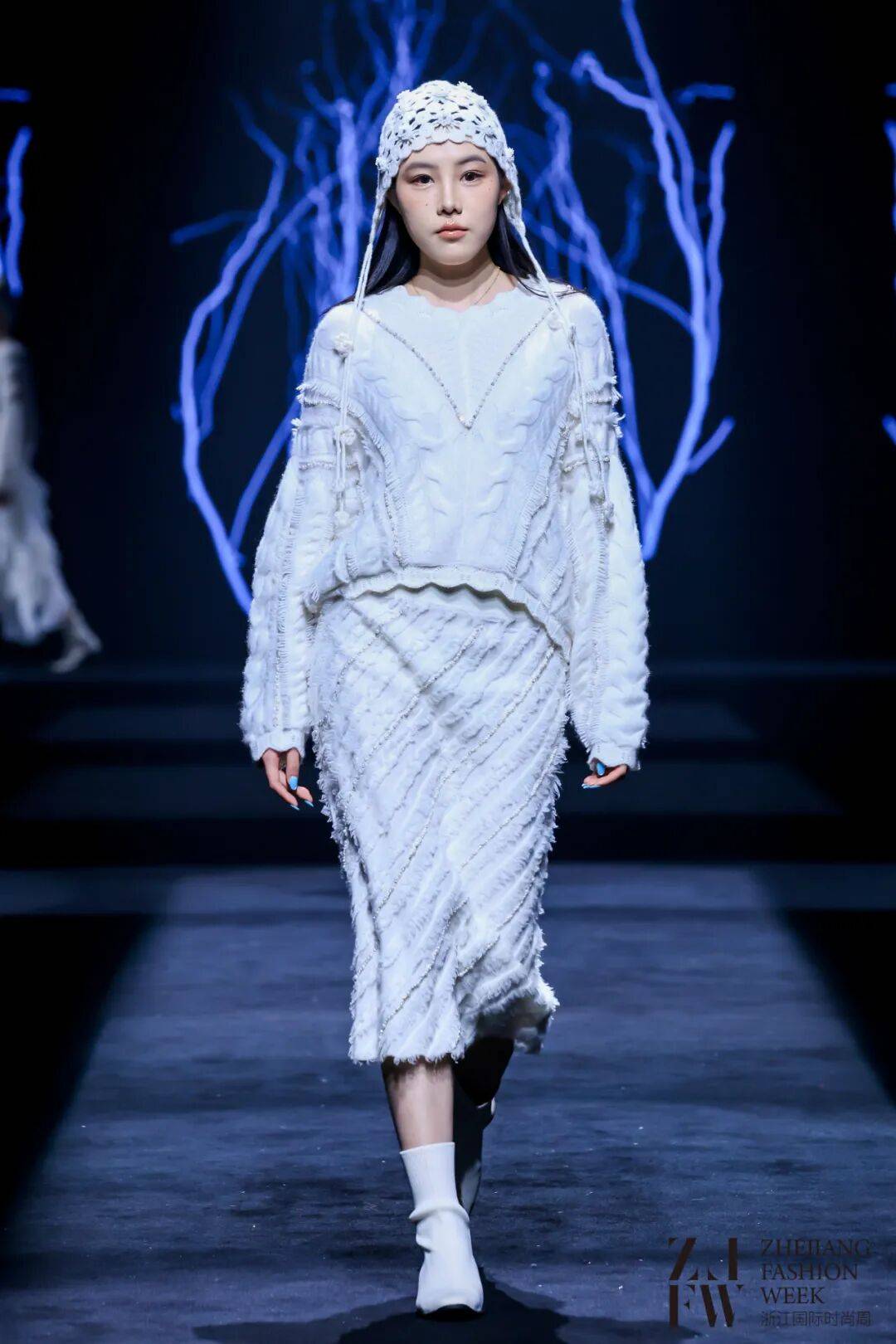 设计师从旅行的感受出发,结合现代审美,将雾凇、沟壑、碎冰溪水的元素抽象化,融入服装线条与针织组织,逐渐形成这一系列的设计概念。