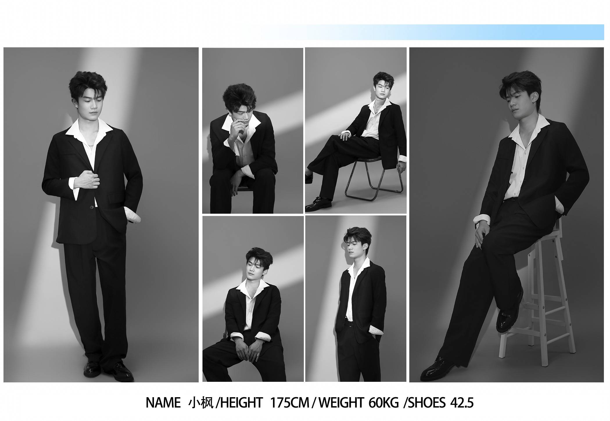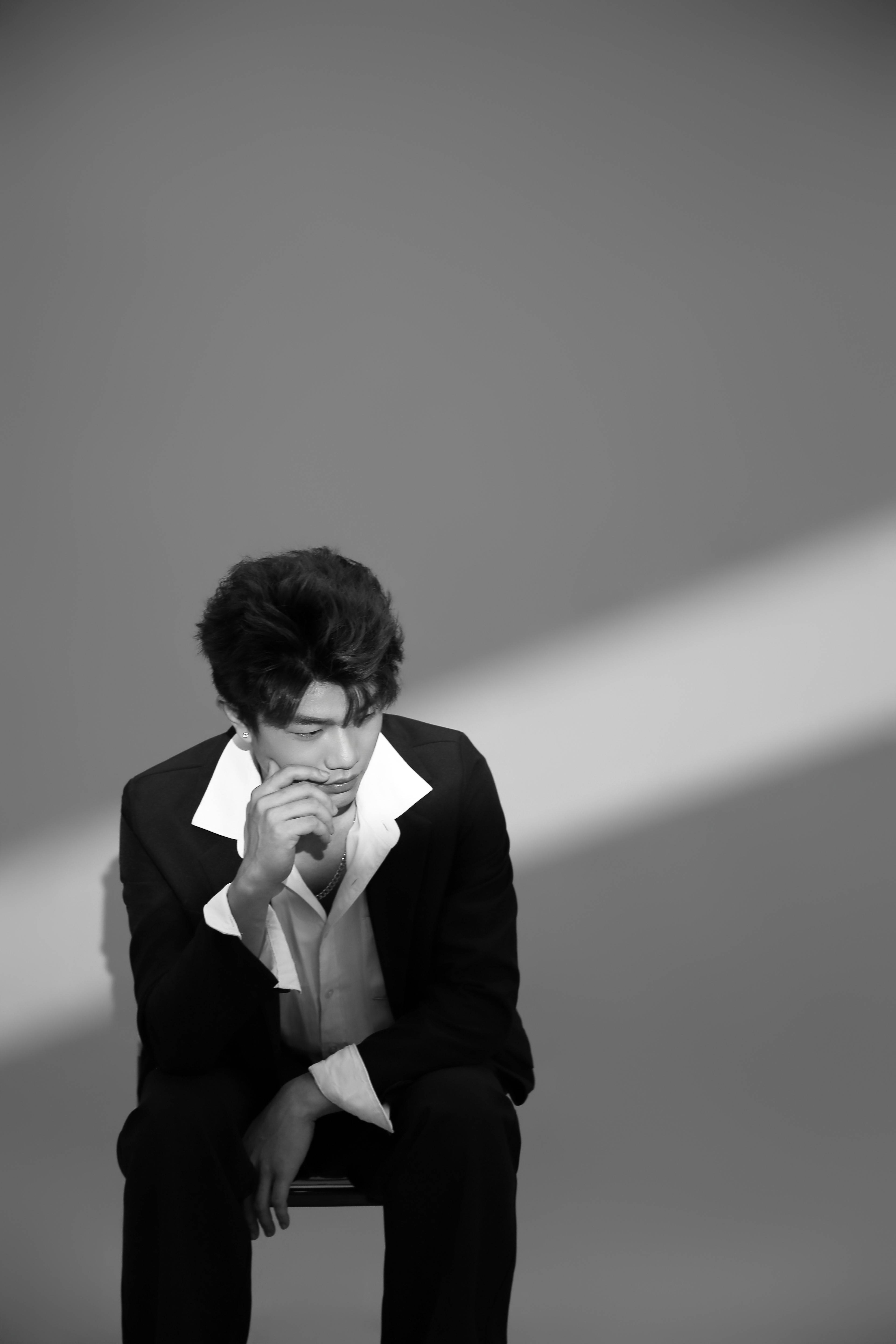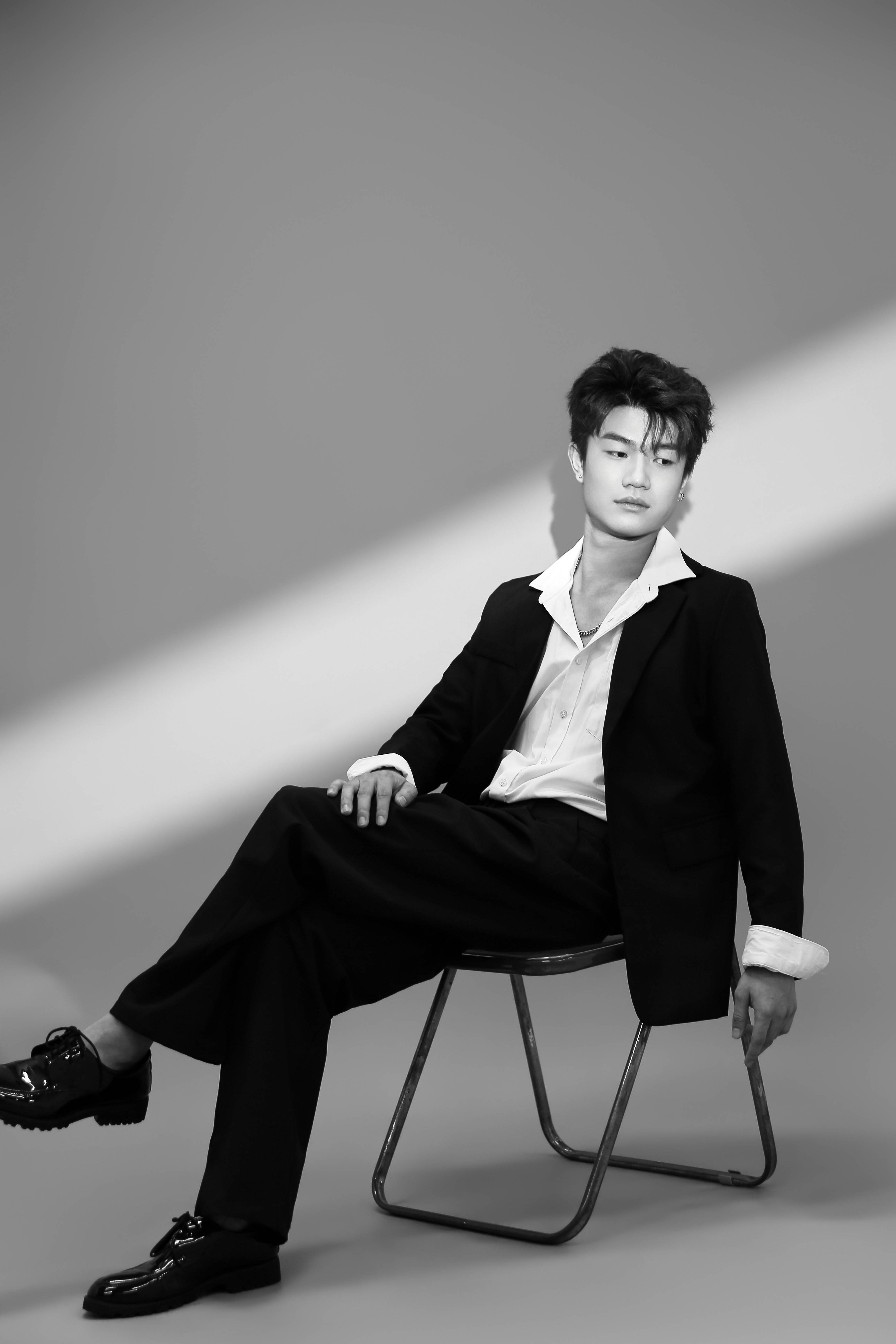 最让人惊喜的,是他穿黑西装的样子。垫肩撑起的轮廓是恰好的气场,白衬衫领口敞开的弧度泄出一点少年的软,本该是 “精英感” 的套装,到了小枫身上却成了 “温柔的锋芒”:他单手撑在椅沿时,膝盖微屈的弧度带着点漫不经心的慵懒,却又在抬眼的瞬间,让眼神里的笃定漫出来 —— 不是咄咄逼人的野心,是 “我准备好接住所有目光” 的坦诚。